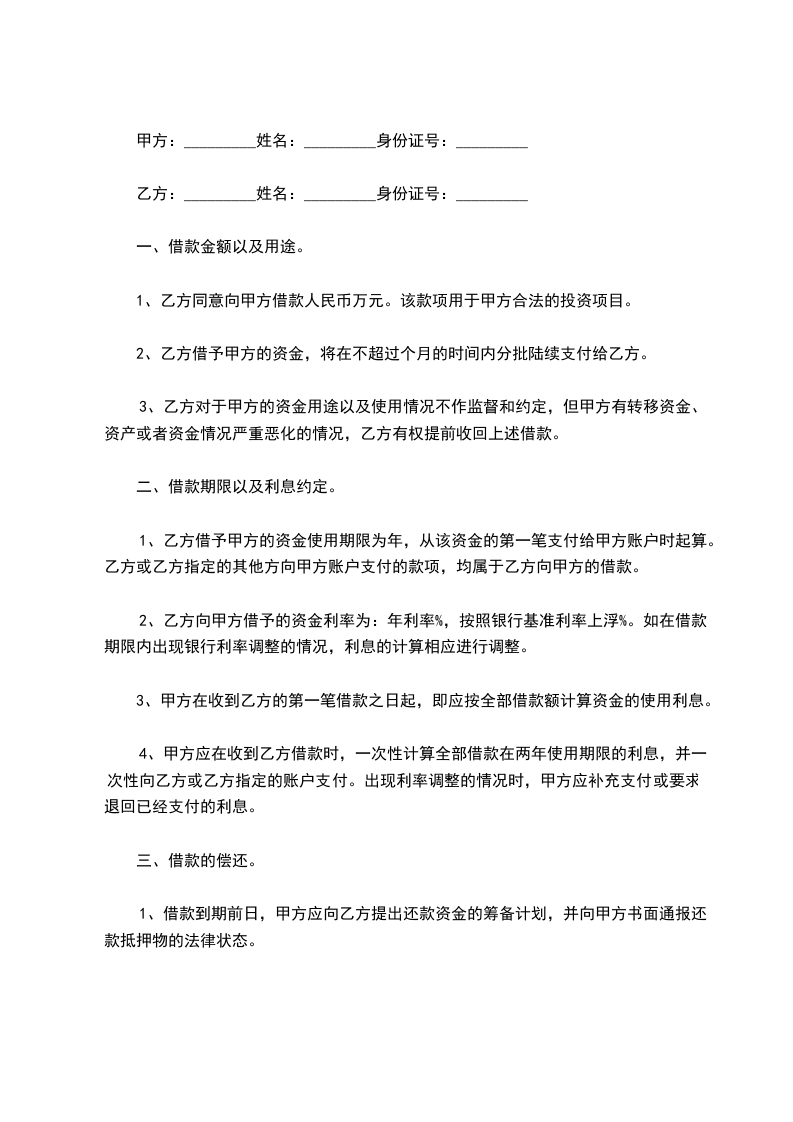 4、乙方仅以其在借款协议中投资项目的股权作为抵押,对向甲方借入的款项承担有限责任,在因经营不善导致投资项目清算时,乙方所得将优先清偿甲方借款,不足部分不再承担偿还责任。
