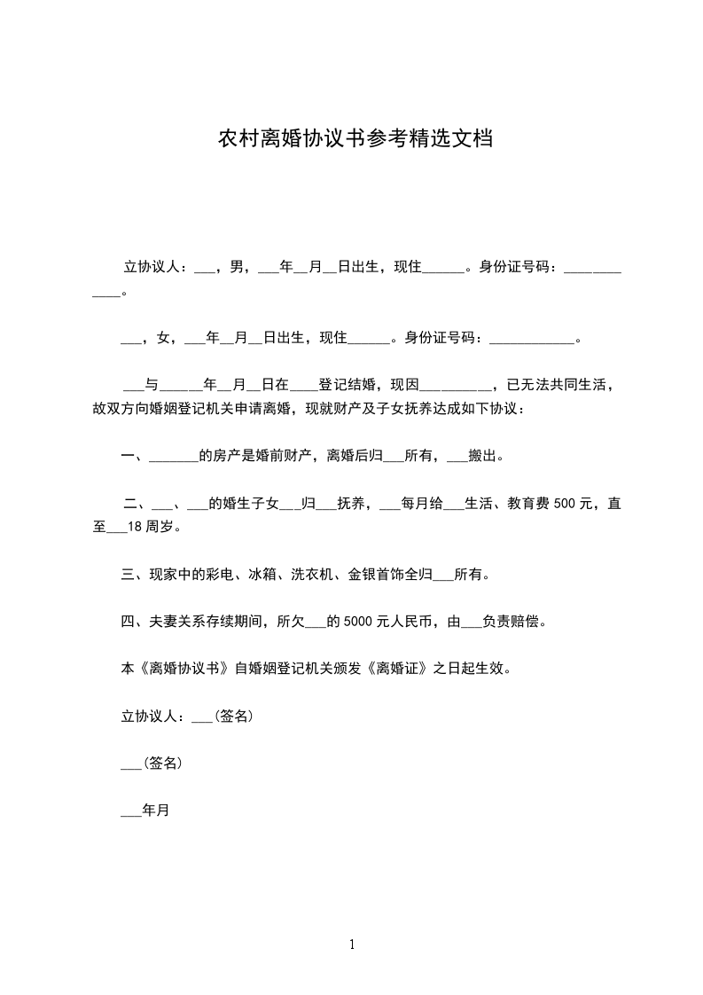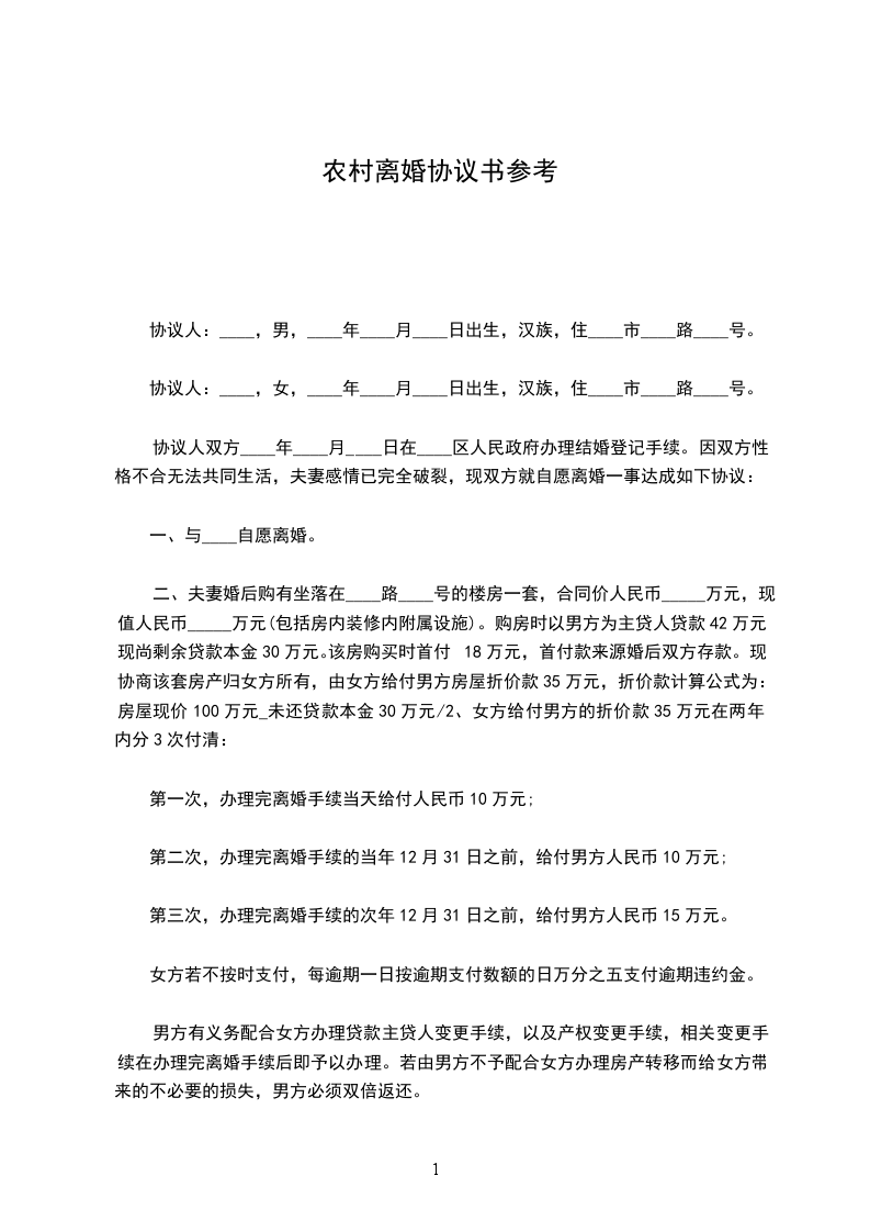 三、坐落在__村的三间三层楼房归乙方所有,其他夫妻共同财产都归甲方所有。甲方支付乙方经济补偿人民币叁拾万元整,_年农历__月__日前一次性付清。