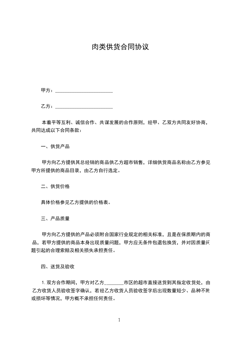 1.双方合作期间,甲方对乙方________市区的超市直接送货到其指定收货处,由乙方收货人员验收签字确认,若经乙方收货人员验收签字后出现数量短少、品种不附或损坏等情况,甲方概不承担任何责任。