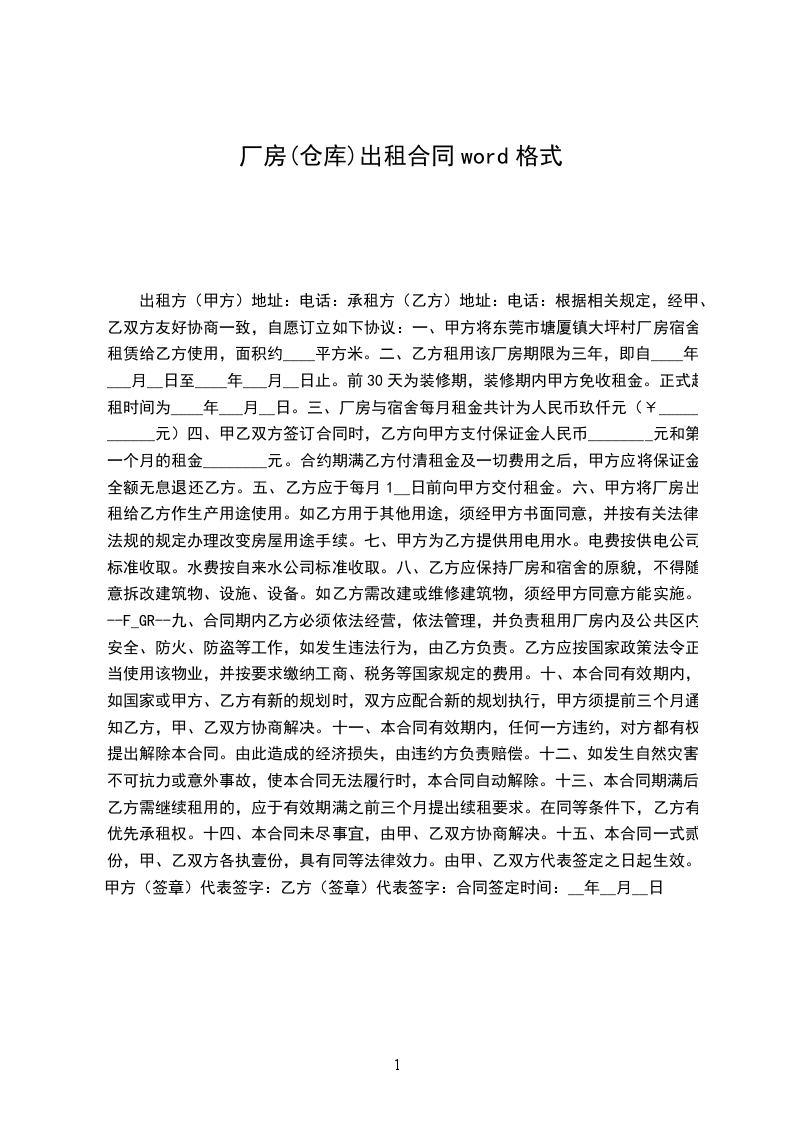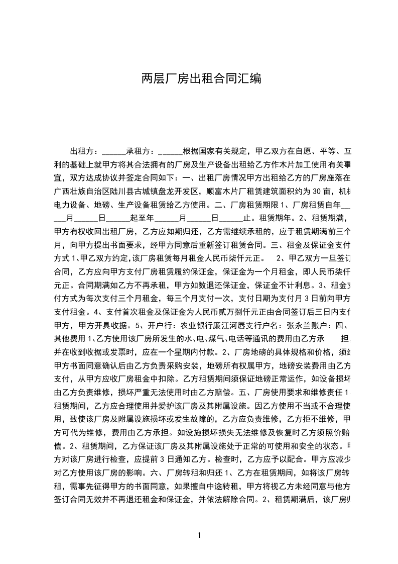 1.1甲方将位于__________________的厂房(以下简称租赁物)租赁于乙方使用。租赁物面积经甲乙双方认可确定为_________平方米。