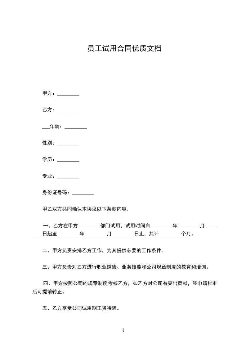一、乙方在甲方_________部门试用,试用时间自_________年_________月_________日起至_________年_________月_________日止,共计_________个月。
