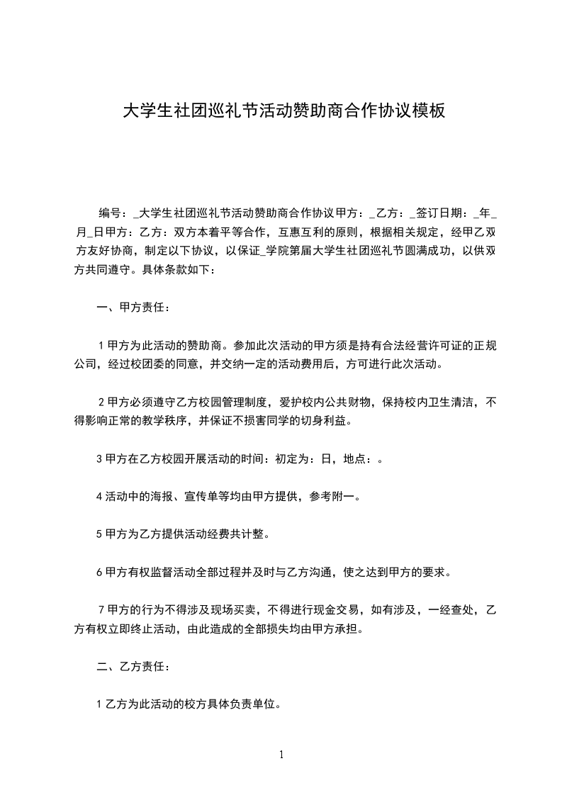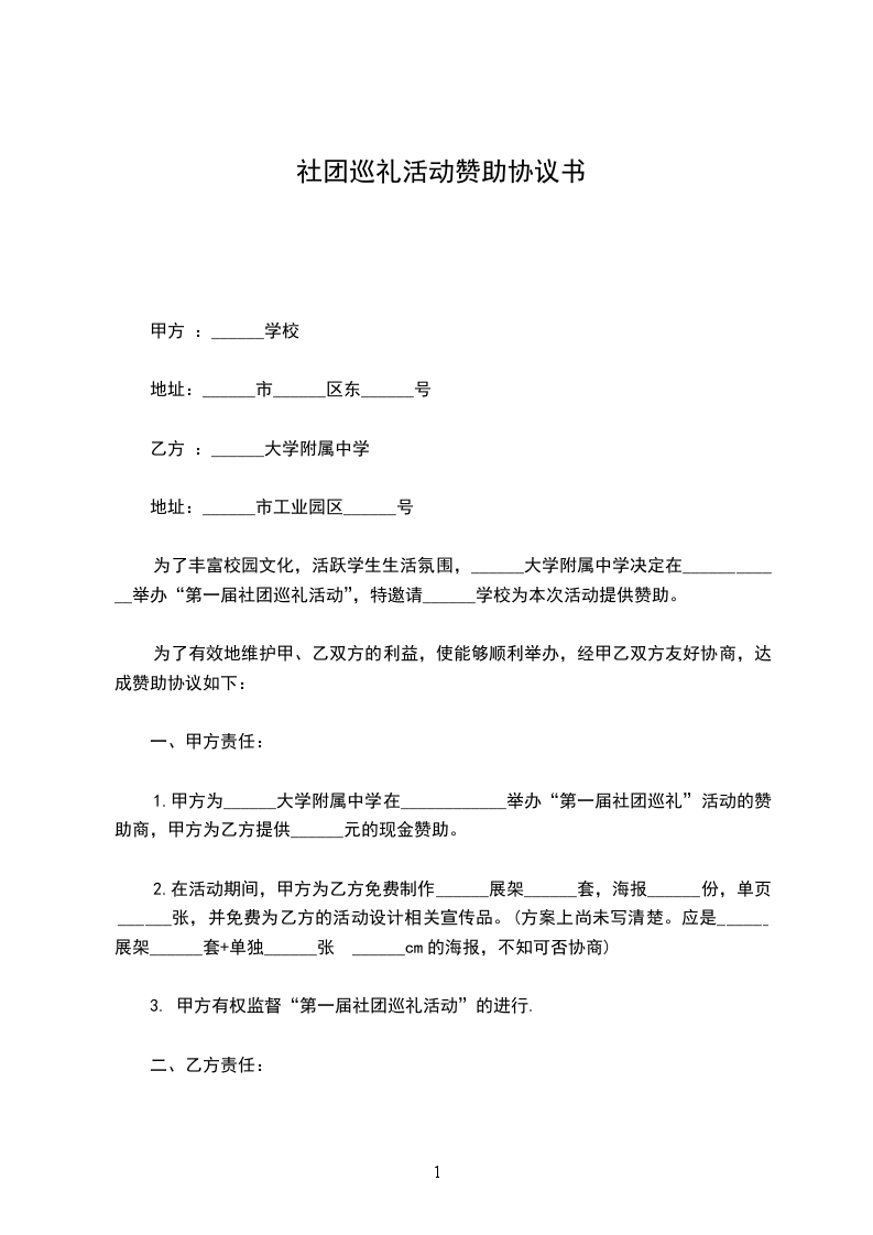 1.甲方为______大学附属中学在____________举办“第一届社团巡礼”活动的赞助商,甲方为乙方提供______元的现金赞助。