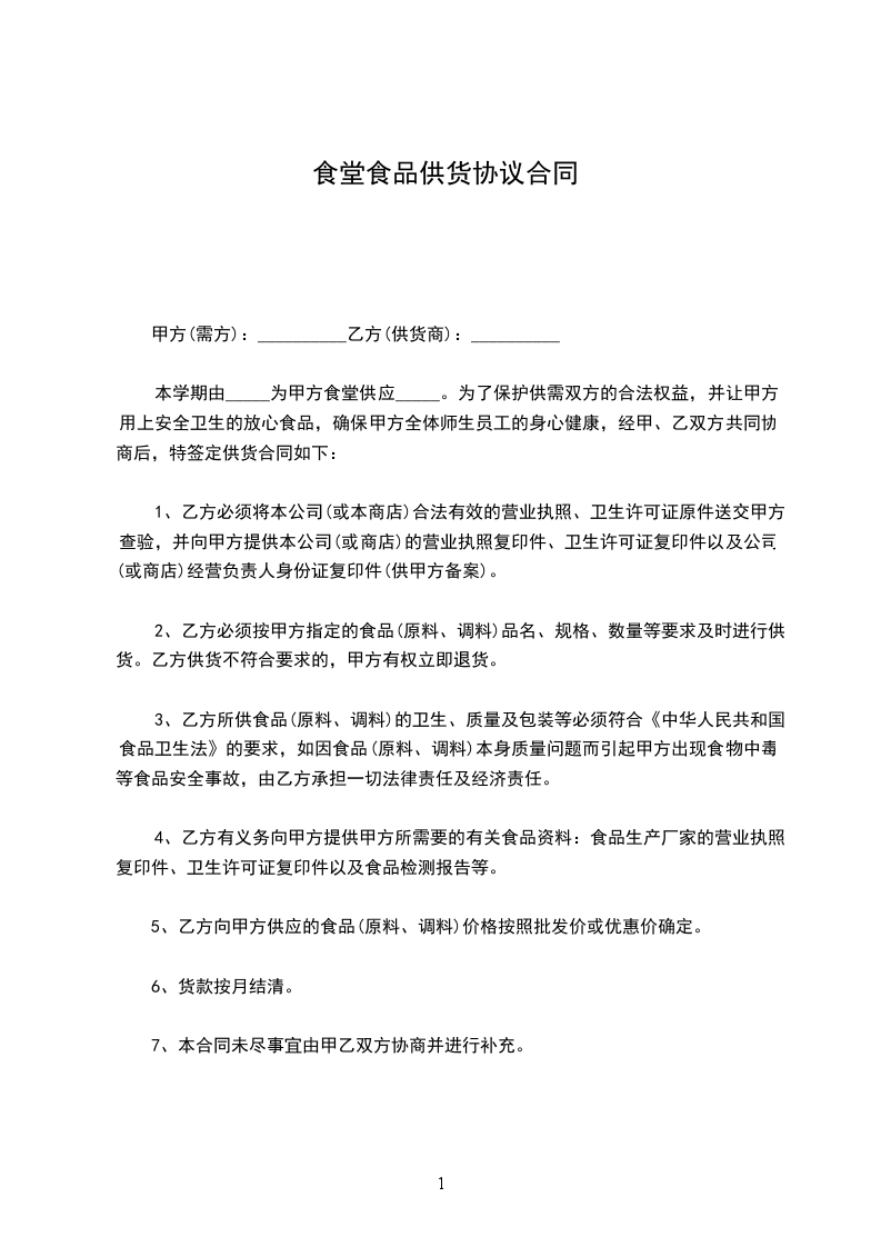 本学期由_____为甲方食堂供应_____。为了保护供需双方的合法权益,并让甲方用上安全卫生的放心食品,确保甲方全体师生员工的身心健康,经甲、乙双方共同协商后,特签定供货合同如下:
