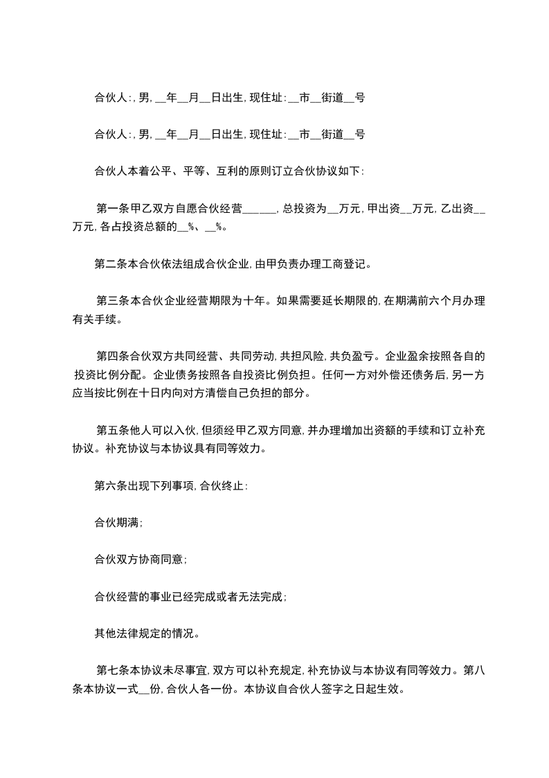 合伙人:甲(姓名),男(女),__年__月__日出生,现住址:__市(县)__