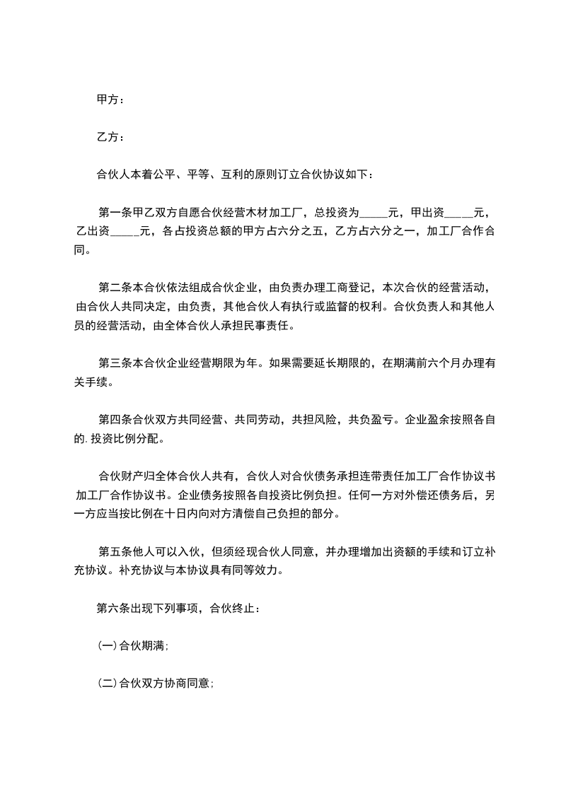 合伙人本着公平、平等、互利的原则订立合伙协议如下: