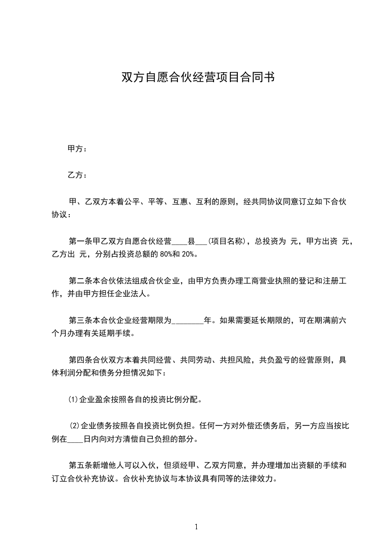 第一条 甲乙双方自愿合伙经营_____(项目名称),总投资为×万元,甲出资____万元,乙出资___万元,各占投资总额的___%、____%。