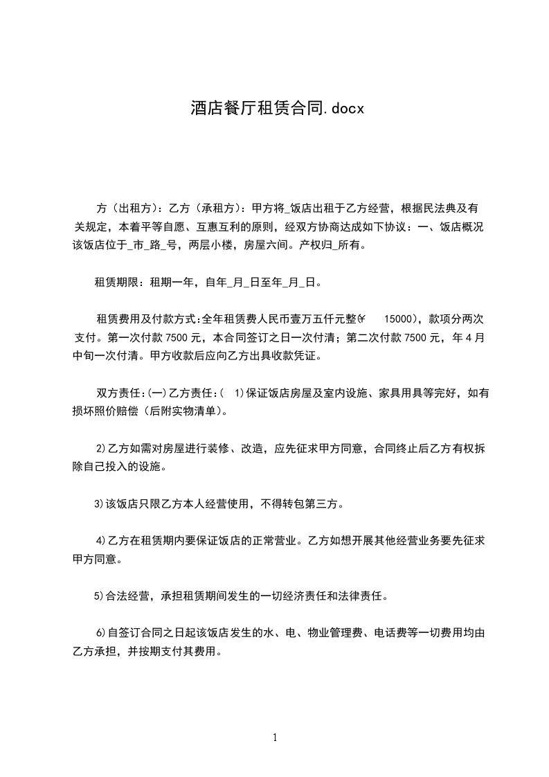 (1)保证饭店房屋及室内设施、家具用具等完好,如有损坏照价赔偿(后附实物清单)。