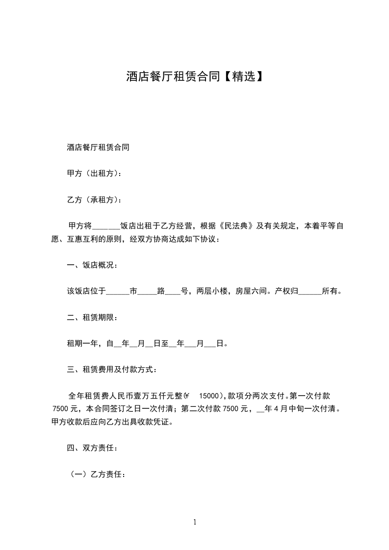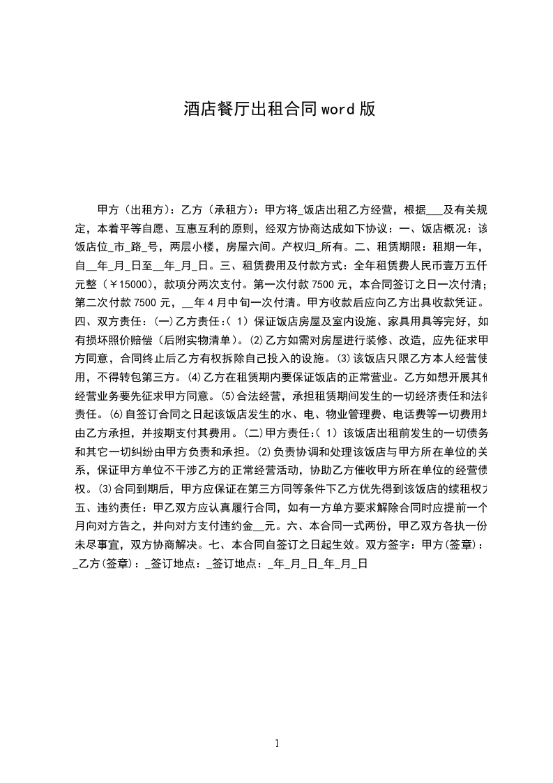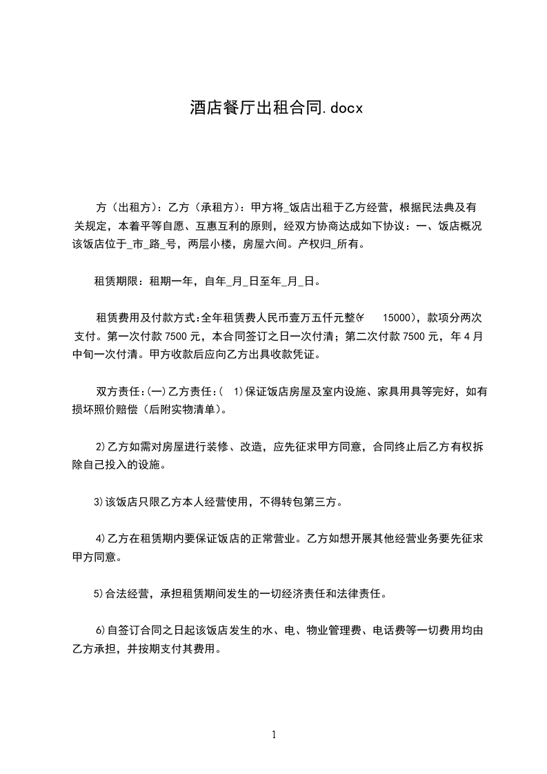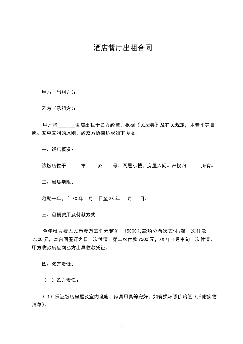 甲方将_______饭店出租于乙方经营,根据《民法典》及有关规定,本着平等自愿、互惠互利的原则,经双方协商达成如下协议: