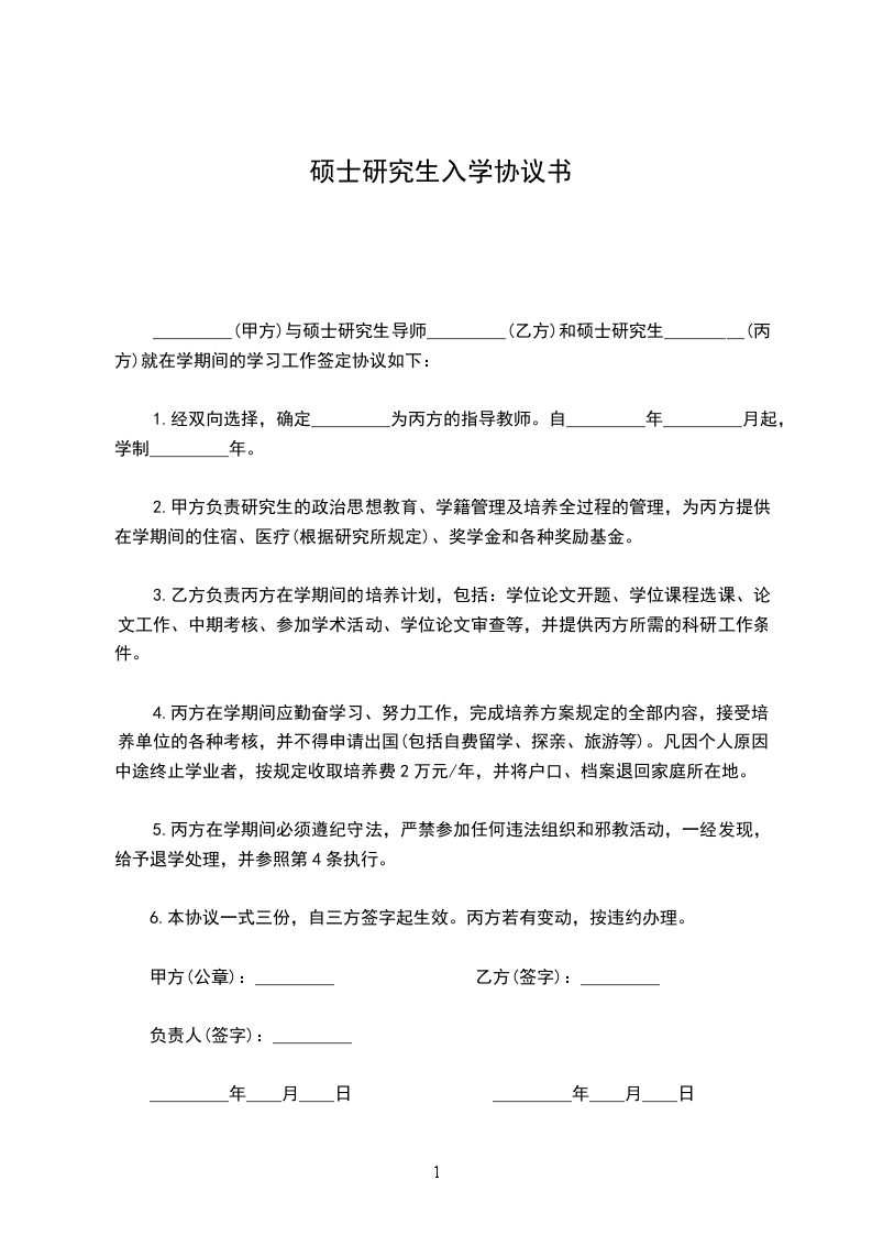 _________(甲方)与硕士研究生导师_________(乙方)和硕士研究生_________(丙方)就在学期间的学习工作签定协议如下: