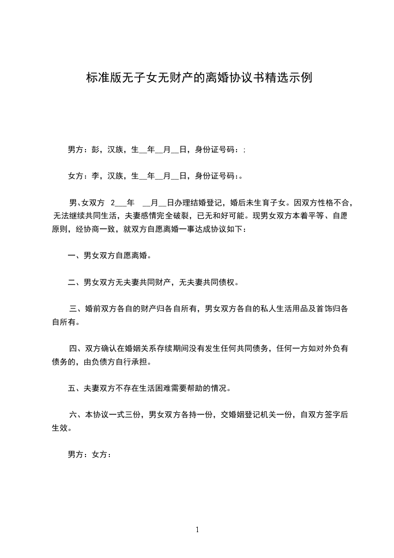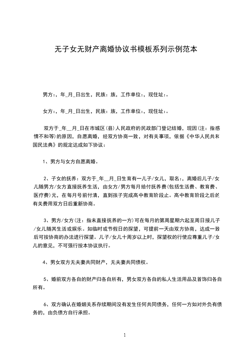 甲乙双方______年______月______日在______市____区民政局登记结婚,甲乙双方无财产、无子女。现因双方____不和,导致夫妻双方感情已然完全破裂,已无法继续共同生活,故双方自愿离婚并达成以下协议: