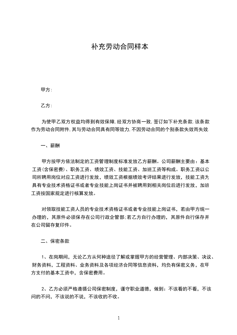 1、在岗期间,无论乙方从何种途径了解或掌握甲方的经营管理、内部决策、决议、财务资料,工程资料、业务资料及各项经济合同等信息资料,均负有保密义务,在甲方支付的基本工资中,含保密费用。