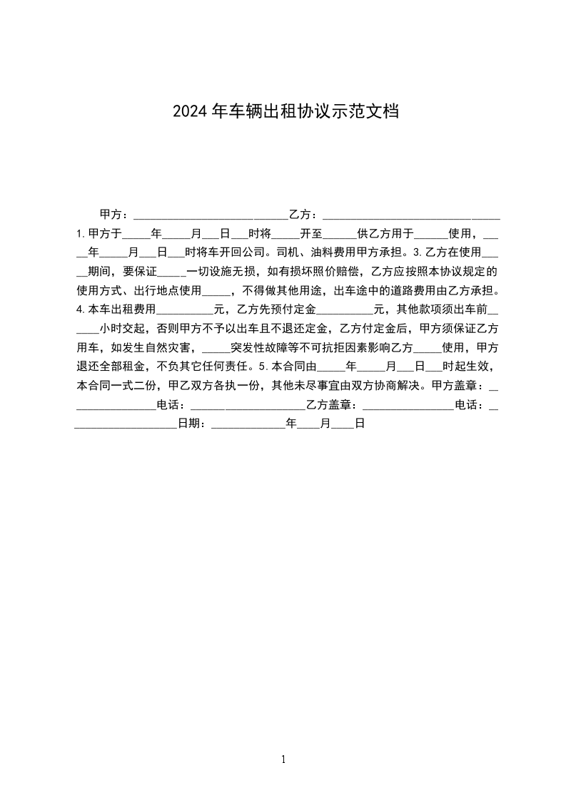 一、甲方自__年__月__日起至__年__月__日将陕B-出租给乙方使用,共计天,每天元,租金为__元。