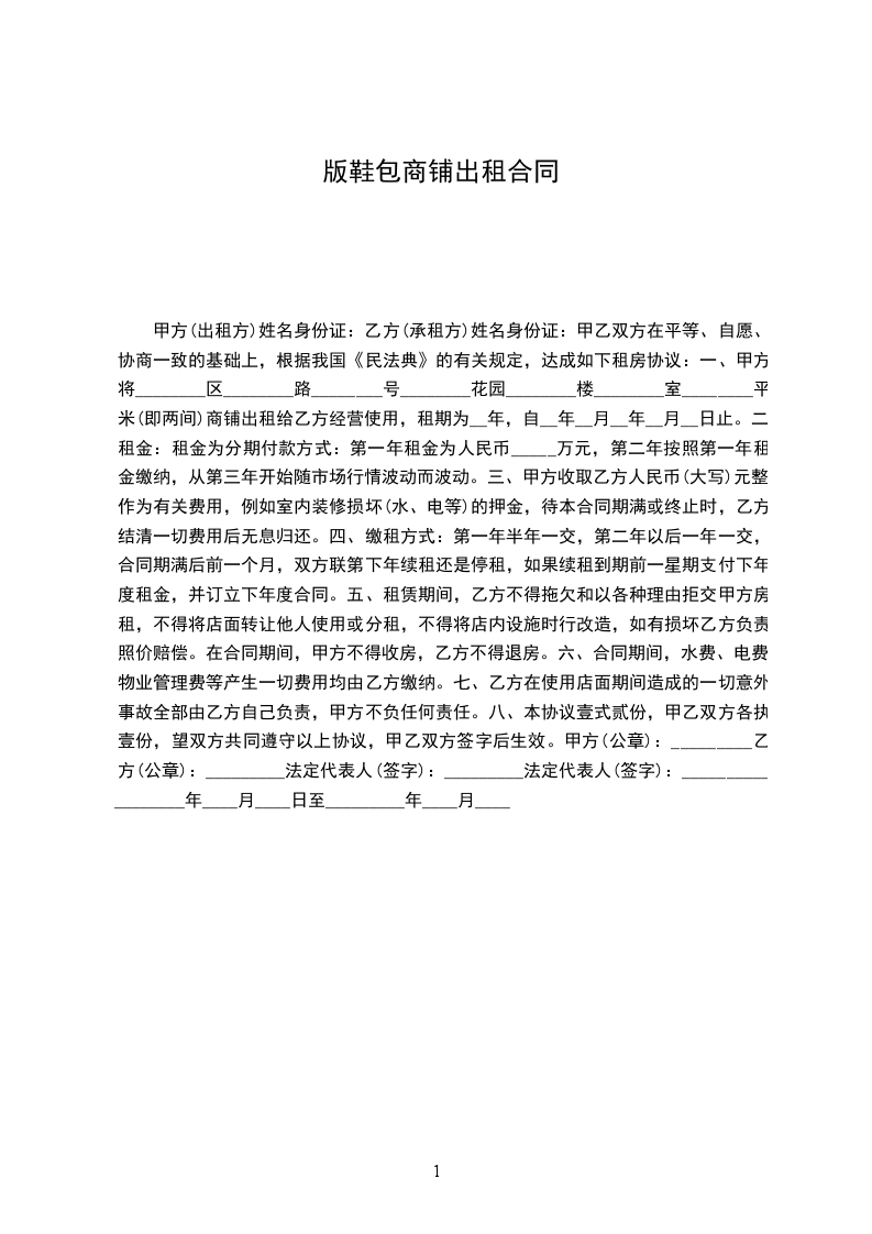 一、甲方将________区________路________号________花园________楼________室________平米(即两间)商铺出租给乙方经营使用,租期为__年,自__年__月__年__月__日止。
