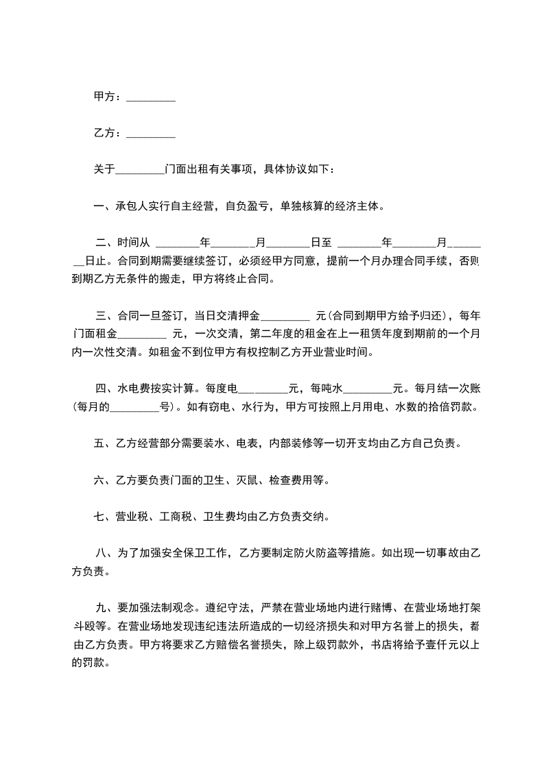 3、在租赁期内,因租赁门面所产生的水、电、卫生费、物业管理费等一切费用由乙方自行承担。