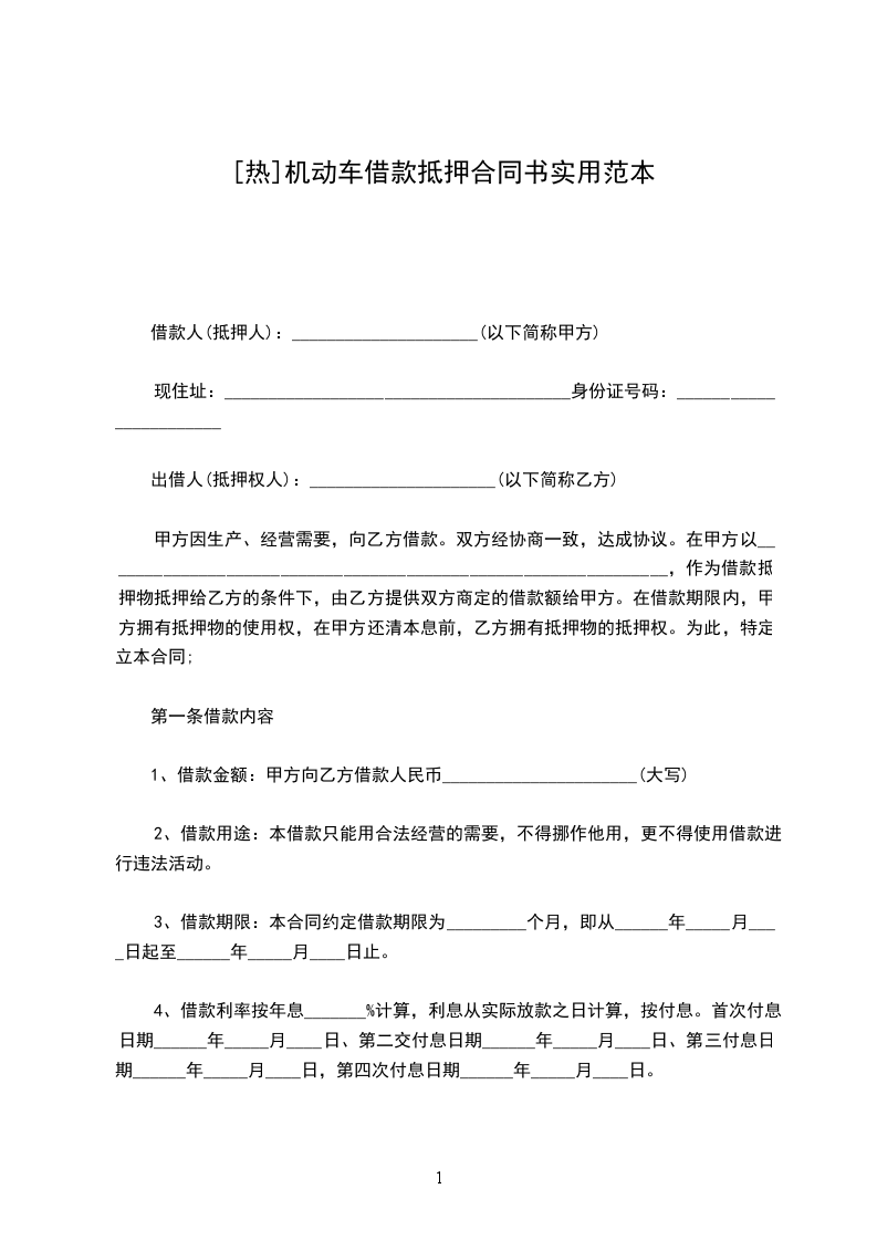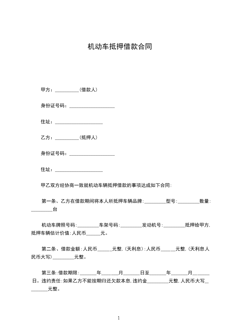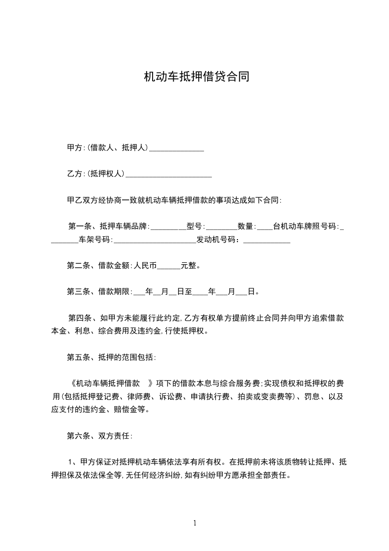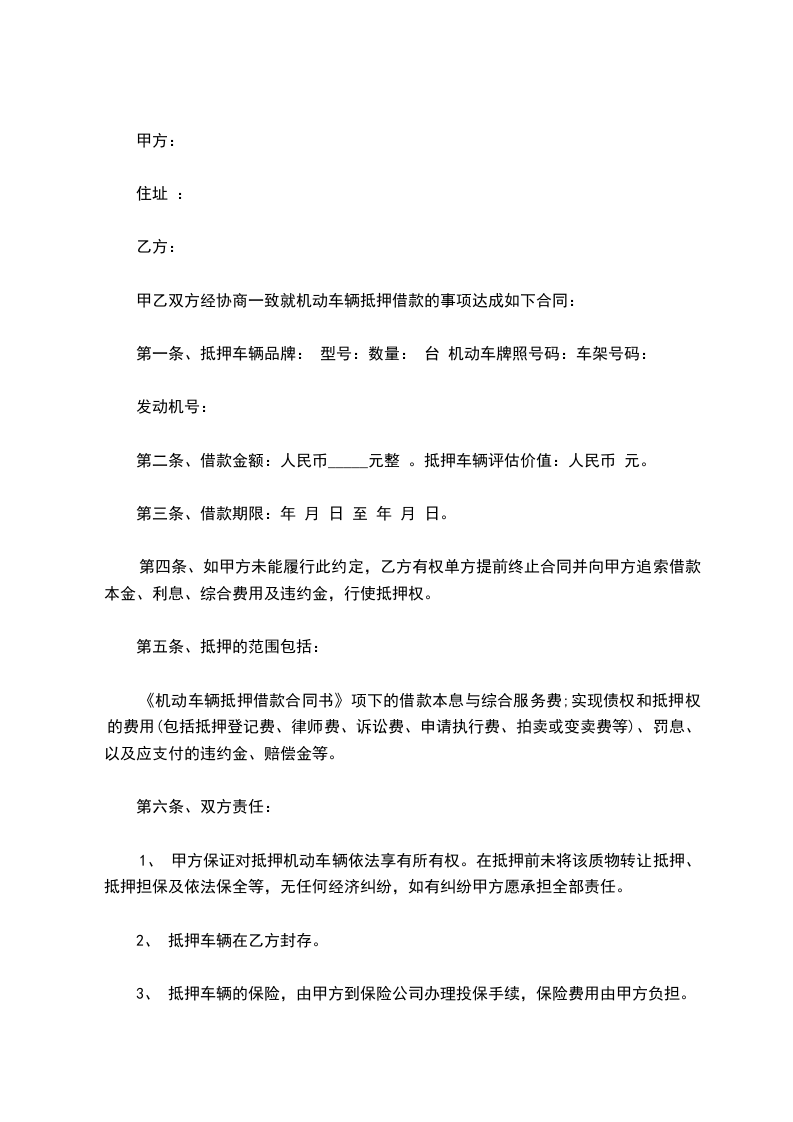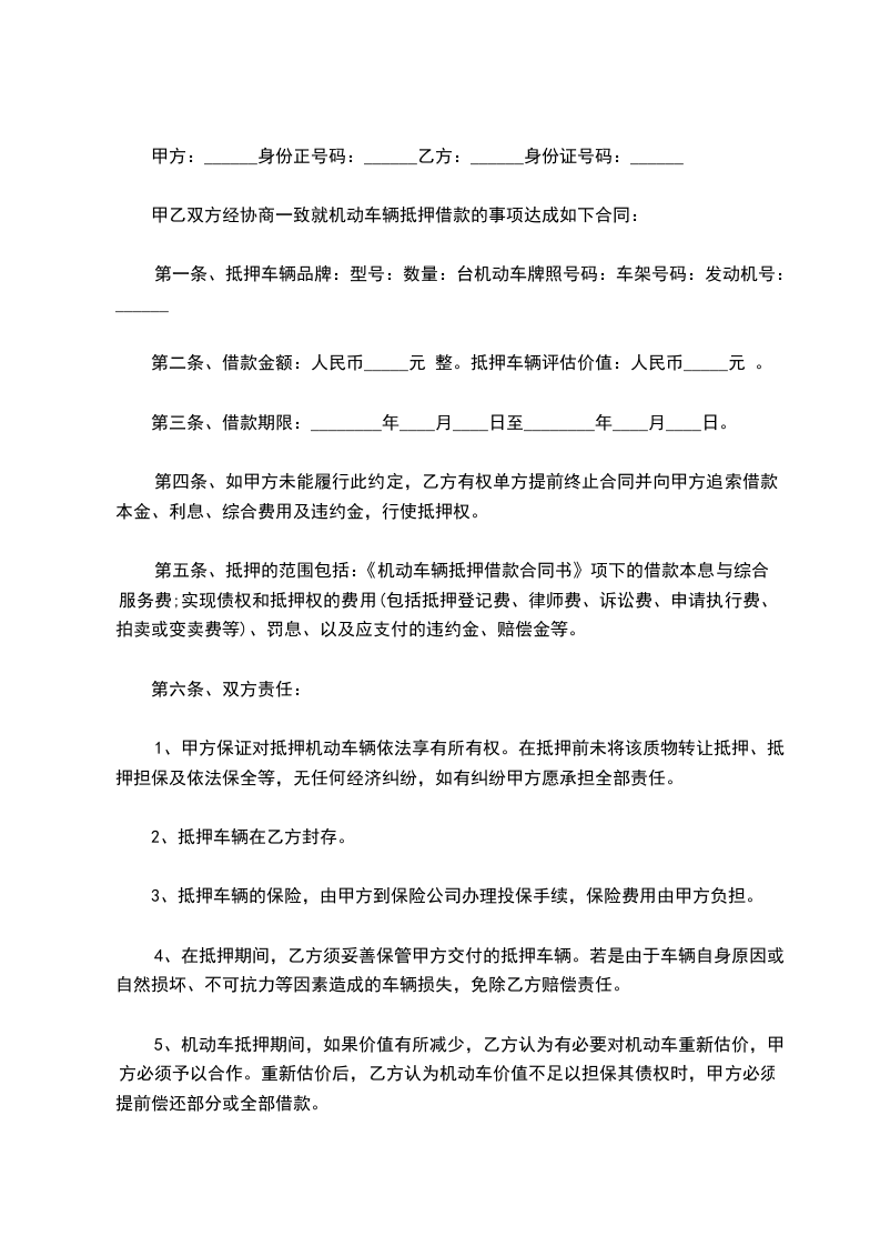 第二条甲方自愿将汽车一台质押给乙方。车辆牌号为:__________,型号:__________,机动车驾驶证号码:______________,发动机号:__________,车架号:__________,双方评估价值__________元整。