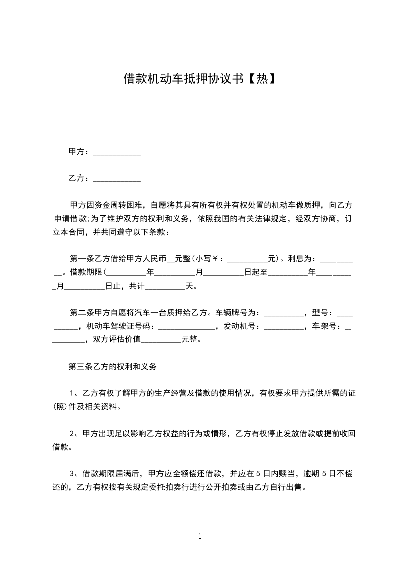 甲方因资金周转困难,自愿将其具有所有权并有权处置的机动车做质押,向乙方申请借款;为了维护双方的权利和义务,依照我国的有关法律规定,经双方协商,订立本合同,并共同遵守以下条款: