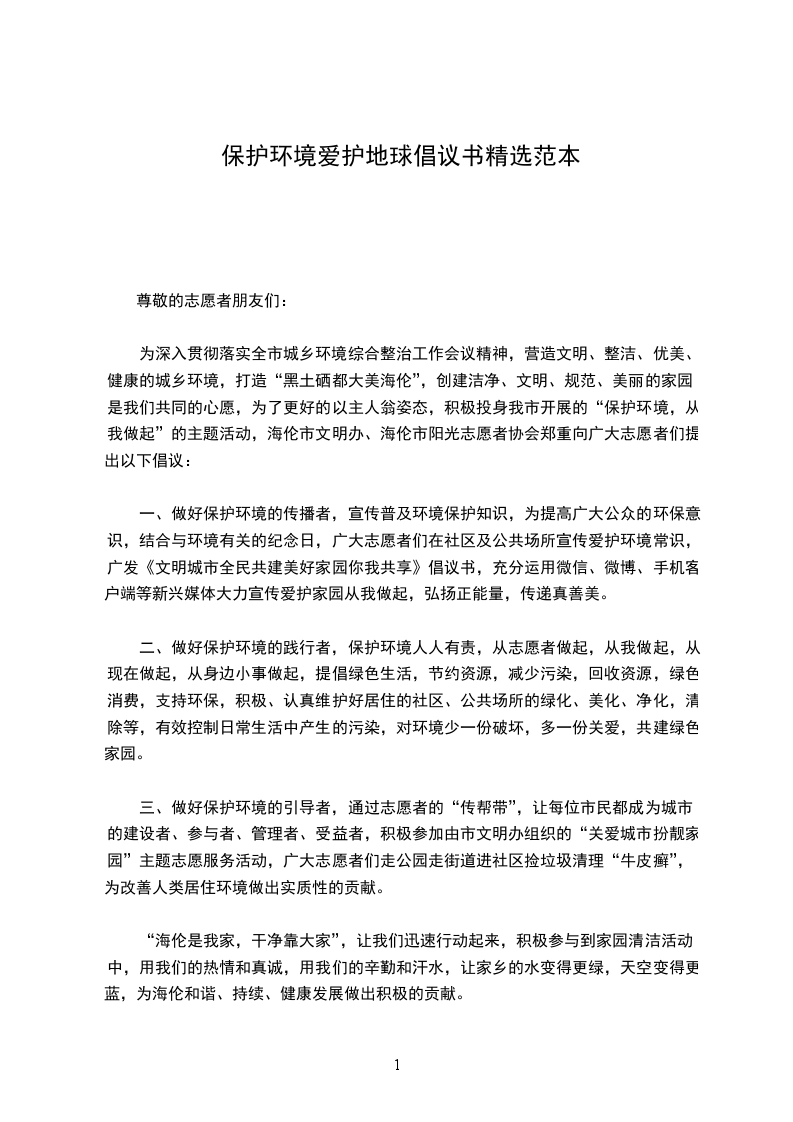 为深入贯彻落实全市城乡环境综合整治工作会议精神,营造文明、整洁、优美、健康的城乡环境,打造“黑土硒都大美海伦”,创建洁净、文明、规范、美丽的家园是我们共同的心愿,为了更好的以主人翁姿态,积极投身我市开展的“保护环境,从我做起”的主题活动,海伦市文明办、海伦市阳光志愿者协会郑重向广大志愿者们提出以下倡议: