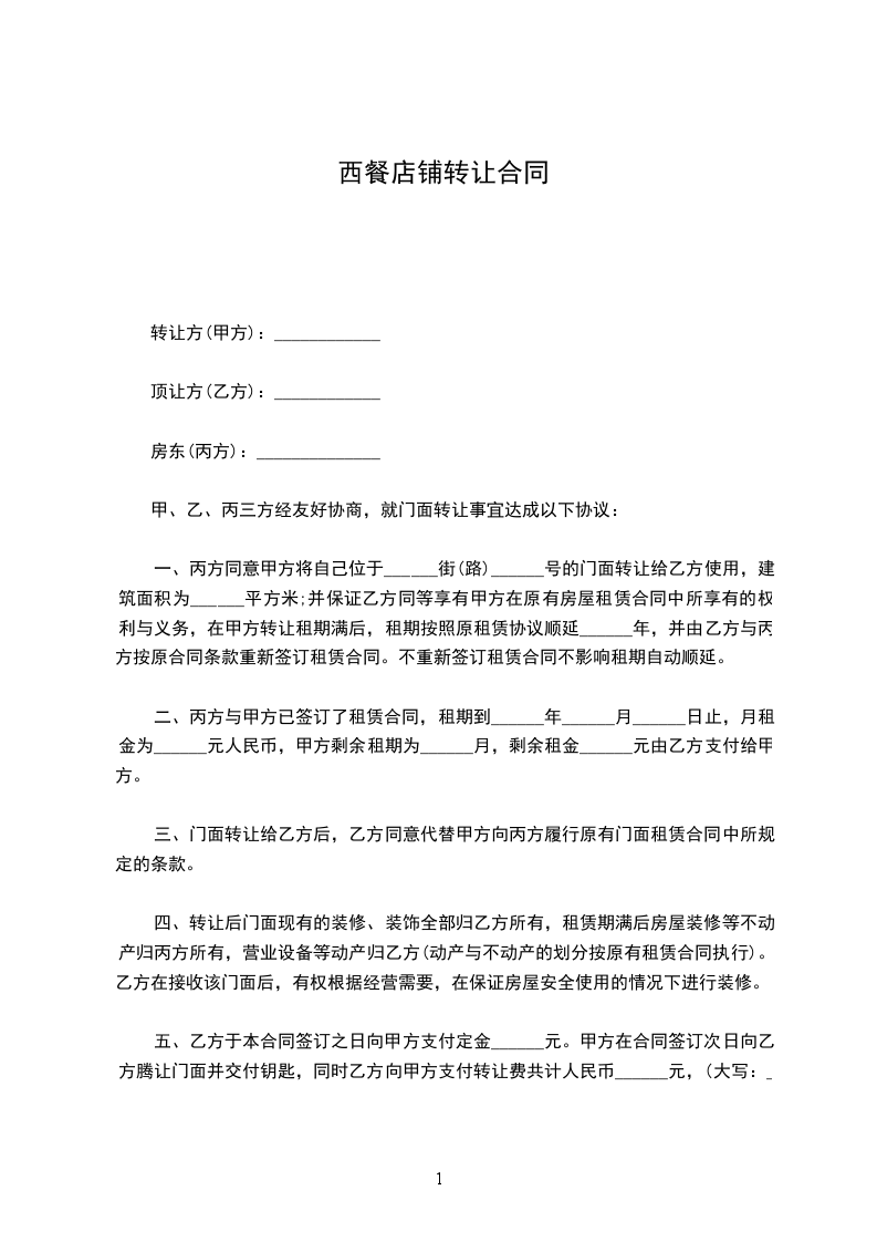 一、丙方同意甲方将自己位于______街(路)______号的门面转让给乙方使用,建筑面积为______平方米;并保证乙方同等享有甲方在原有房屋租赁合同中所享有的权利与义务,在甲方转让租期满后,租期按照原租赁协议顺延______年,并由乙方与丙方按原合同条款重新签订租赁合同。不重新签订租赁合同不影响租期自动顺延。
