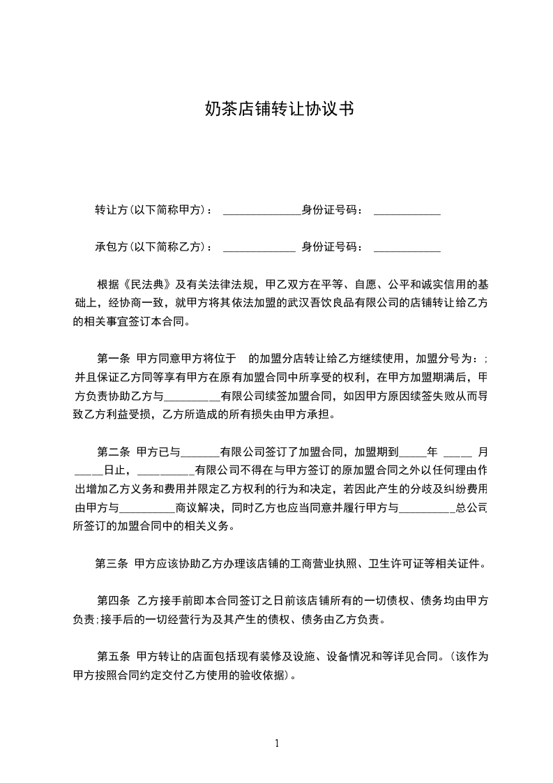 经甲乙双方友好协商,就_____市_____区_____街_____号奶茶店转让事宜达成协议签订本转让合同。