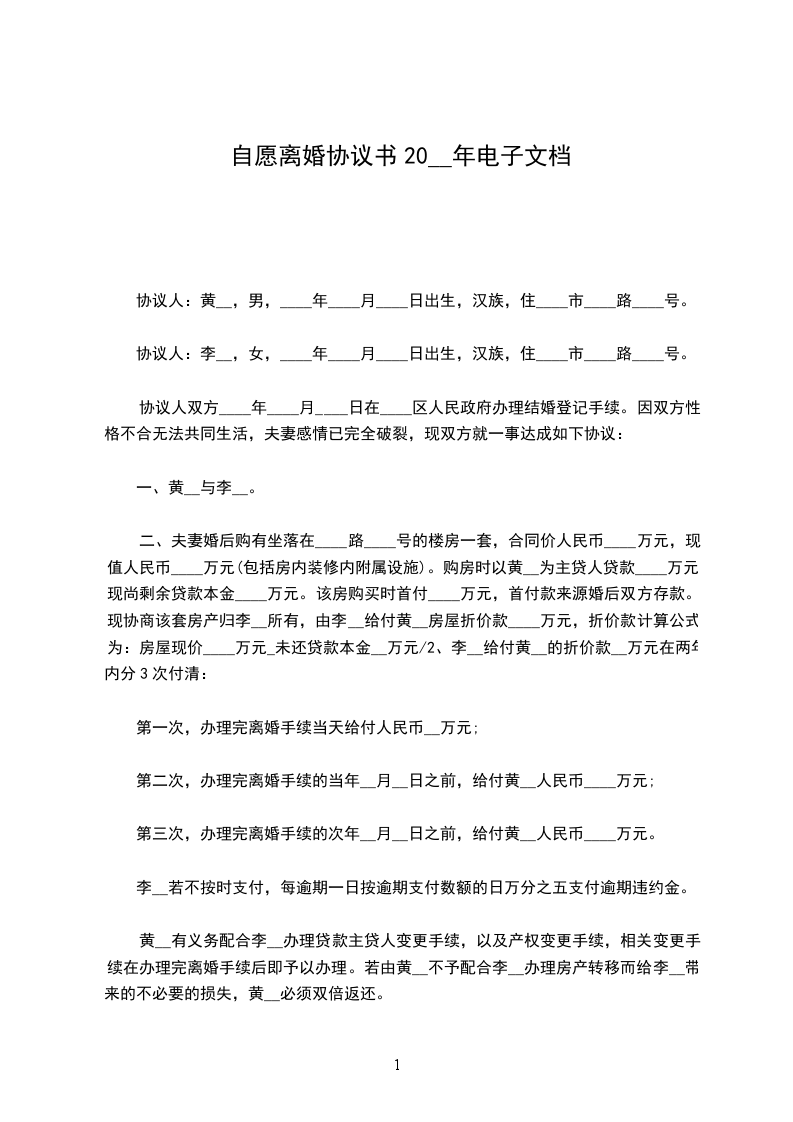 男方:(姓名),_年_月_日出生,民族:_族,工作单位:___,现住址:__。女方:(姓名),_年_月_日出生,民族:_族,工作单位:___,现住址:__。双方_年_月_日在_市_城区(县)人民政府的民政部门登记结婚,现因__的原因(注:原因应当写明感情破裂、无和好的可能),自愿离婚,经双方协商一致,对有关事项,依据《中华人民共和国民法典》规定达成如下协议:
