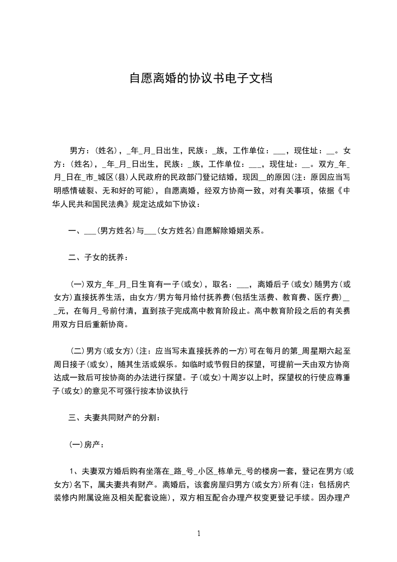 一、___(男方姓名)与___(女方姓名)自愿解除婚姻关系。
