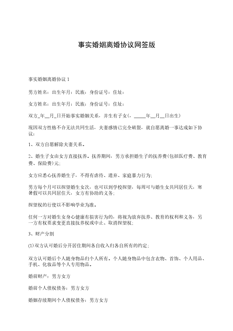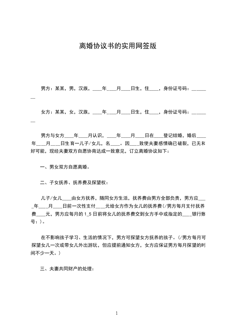 男方与女方____年____月认识,____年____月____日在____登记结婚,婚后____年____月____日生育一儿子/女儿,名____。因____致使夫妻感情确已破裂,已无和好可能,现经夫妻双方自愿协商达成一致意见,订立离婚协议如下: