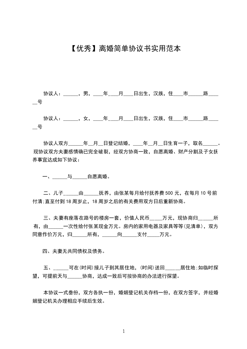 五、本协议一式三份,自办理(离婚证)之日起生效。男女双方各执一份,婚姻登记机关存档一份。