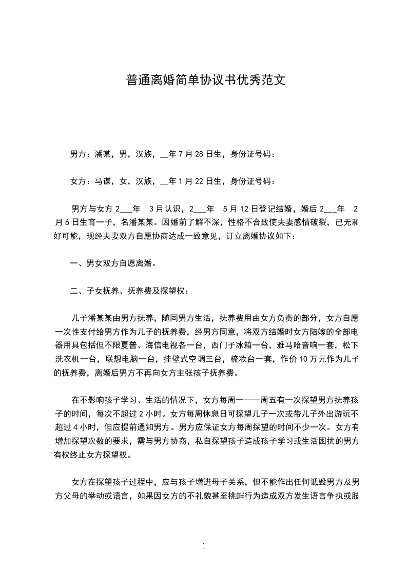 1、儿子___,___年__月生,现年_岁,由男方抚养,随同男方生活。(在男方对孩子照顾不力或无力抚养的情况下,或在孩子自愿跟随女方生活的情况下,可协商由女方抚养)