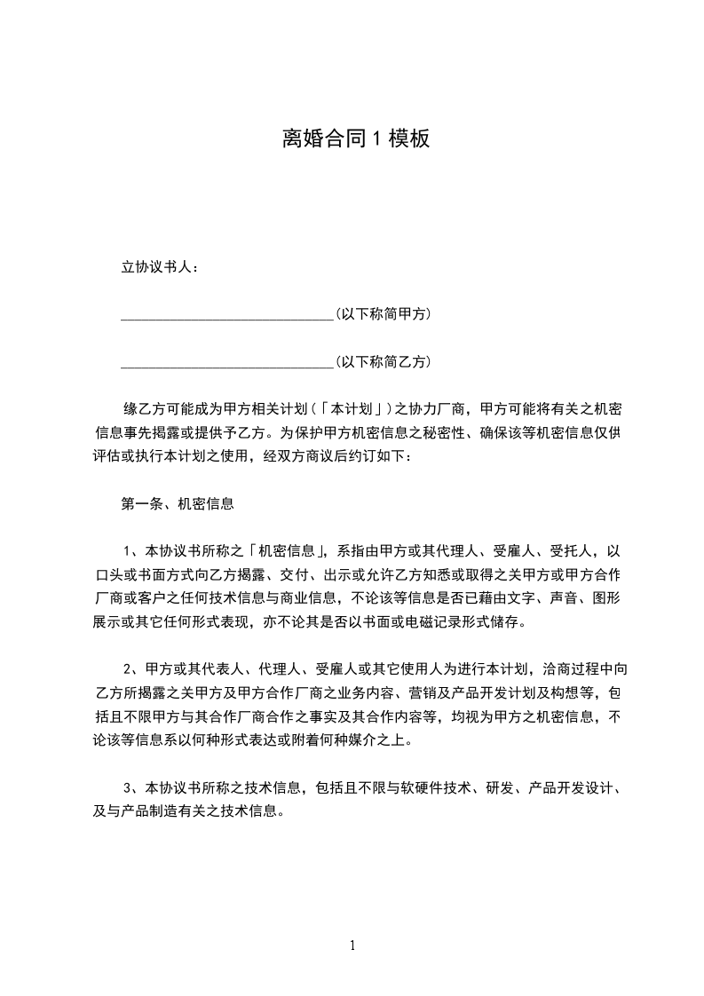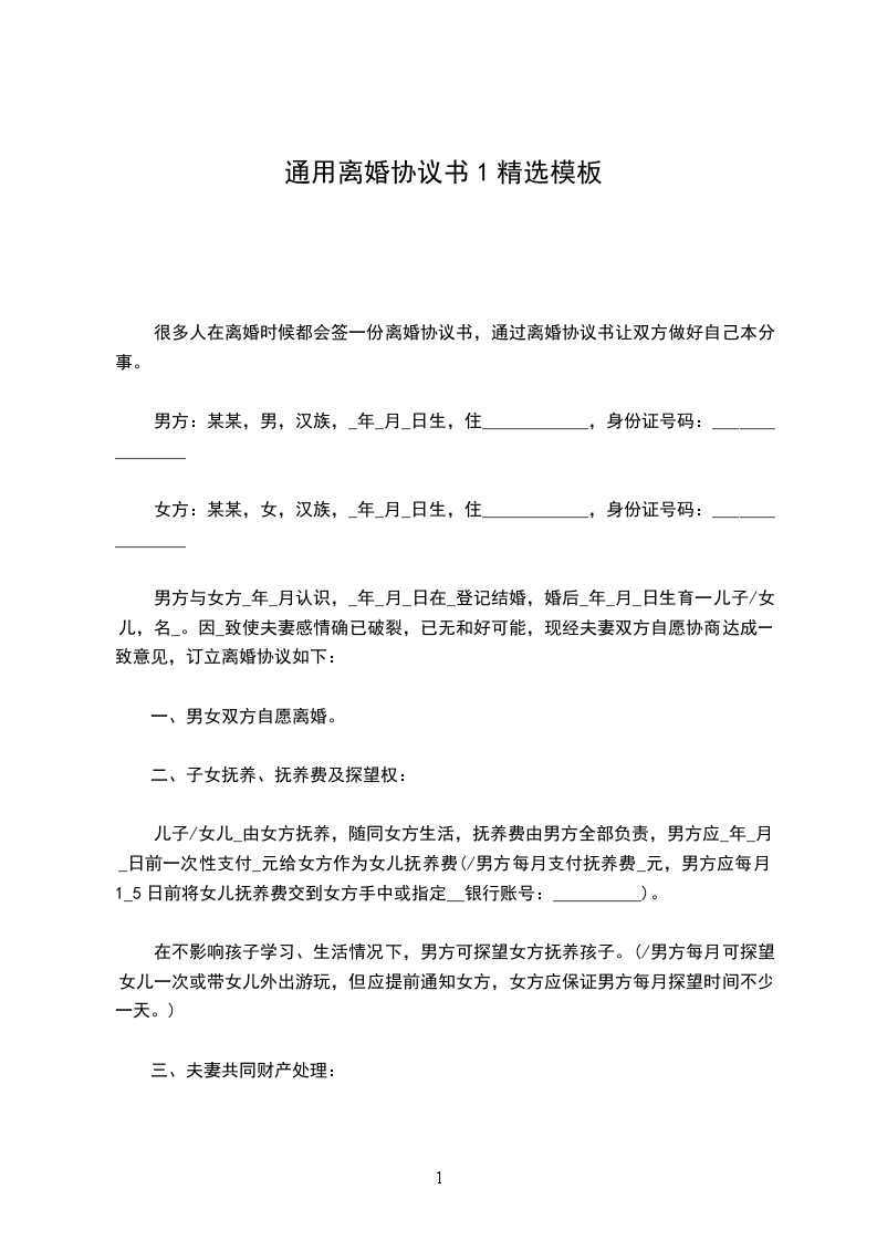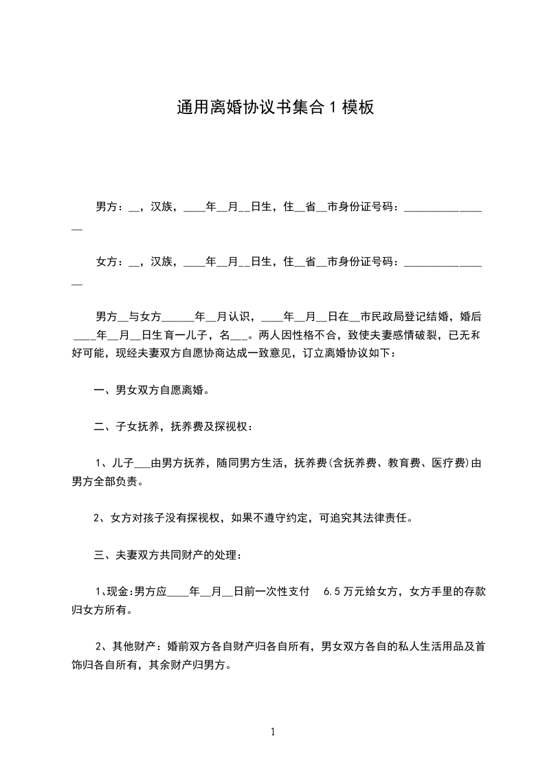 男方__与女方______年__月认识,____年__月__日在__市民政局登记结婚,婚后____年__月__日生育一儿子,名___。两人因性格不合,致使夫妻感情破裂,已无和好可能,现经夫妻双方自愿协商达成一致意见,订立离婚协议如下: