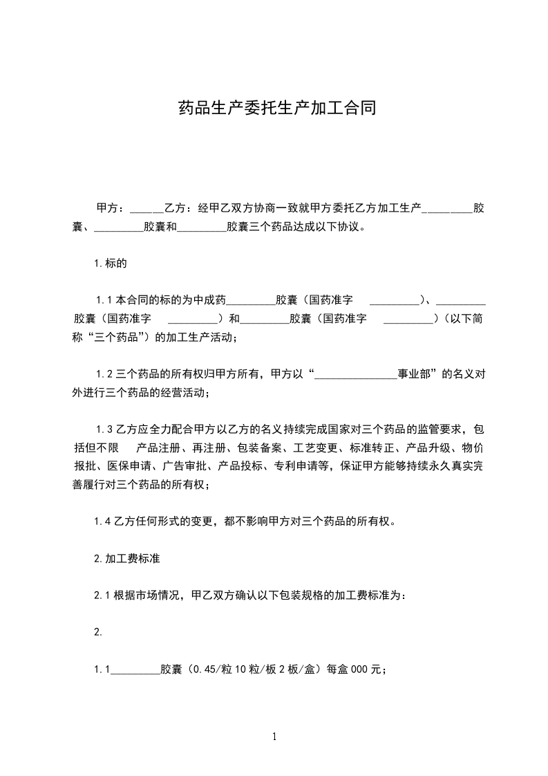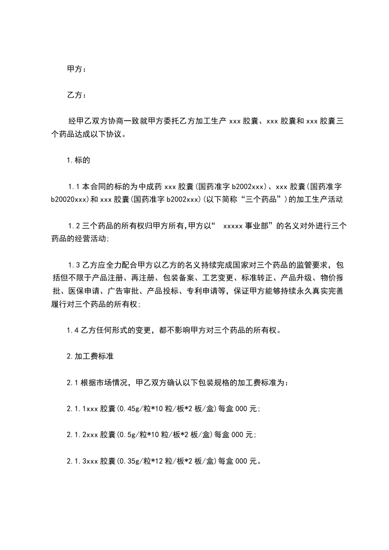 1.1本合同的标的为中成药xxx胶囊(国药准字b2002xxx)、xxx胶囊(国药准字b20020xxx)和xxx胶囊(国药准字b2002xxx)(以下简称“三个药品”)的加工生产活动;
