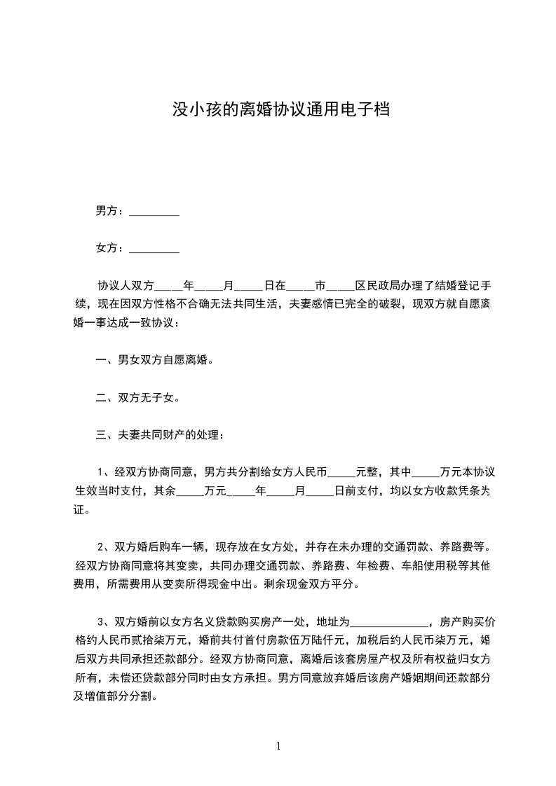 1、经双方协商同意,男方共分割给女方人民币_____元整,其中_____万元本协议生效当时支付,其余_____万元_____年_____月_____日前支付,均以女方收款凭条为证。
