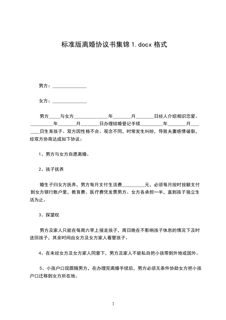 男方_____与女方_______________年________月________日经人介绍相识恋爱。__________年________月________日办理结婚登记手续__________年________月________日生育孩子。双方因性格不合、观念不同,时常发生纠纷,导致夫妻感情破裂,经双方协商达成如下协议: