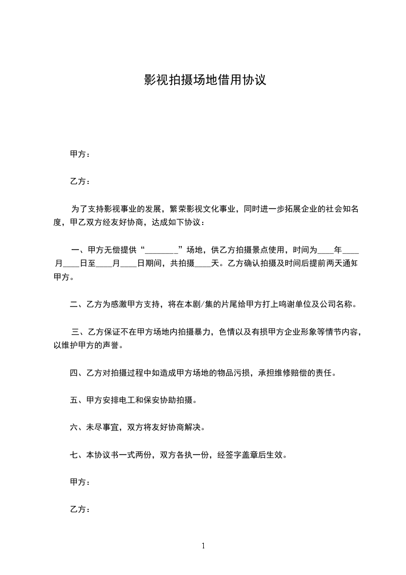 一、甲方无偿提供“________”场地,供乙方拍摄景点使用,时间为____年____月____日至____月____日期间,共拍摄____天。乙方确认拍摄及时间后提前两天通知甲方。