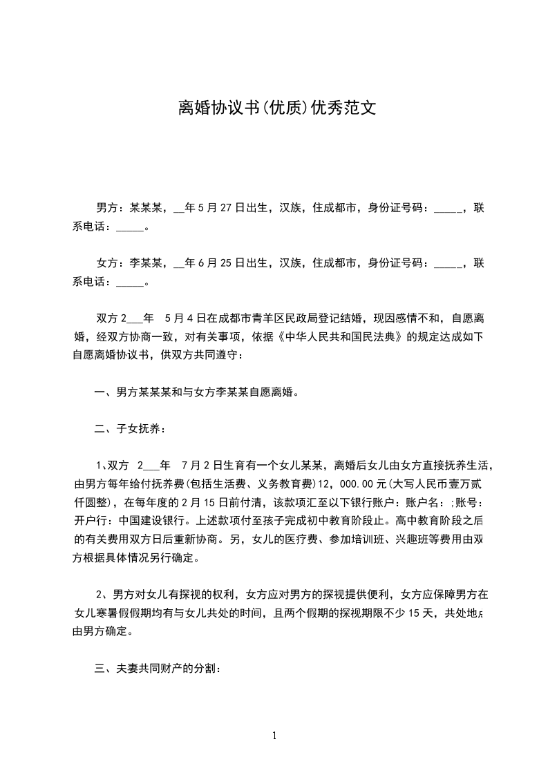 男方与女方______年____月相识,并______年____月____日在_________民政局登记结婚,婚后______年____月____日生育一儿子/女儿,名_________。因____________________________致使夫妻双方感情破裂,且已无任何和好可能,现经双方自愿协商达成一致意见,订立离婚协议如下: