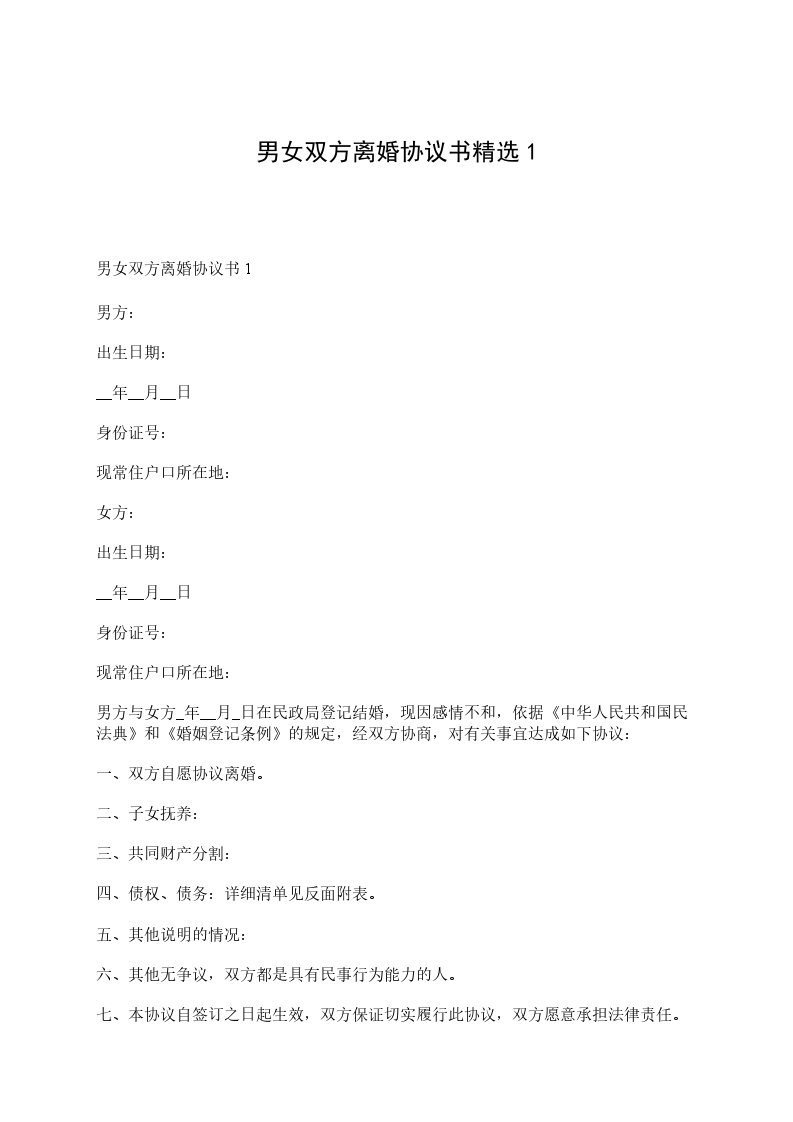 男女双方离婚协议书1