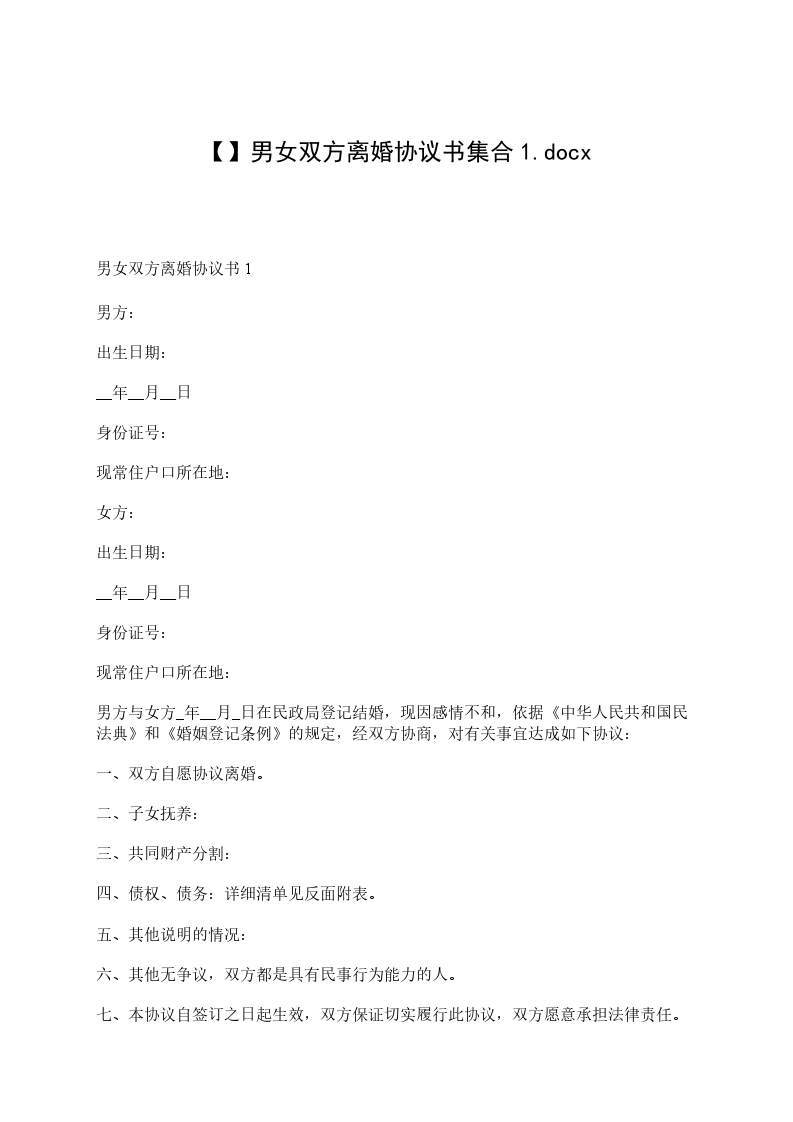 男女双方离婚协议书男方:___,汉族,__年_月_日生,身份证号码:________