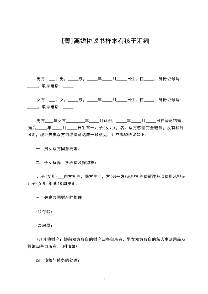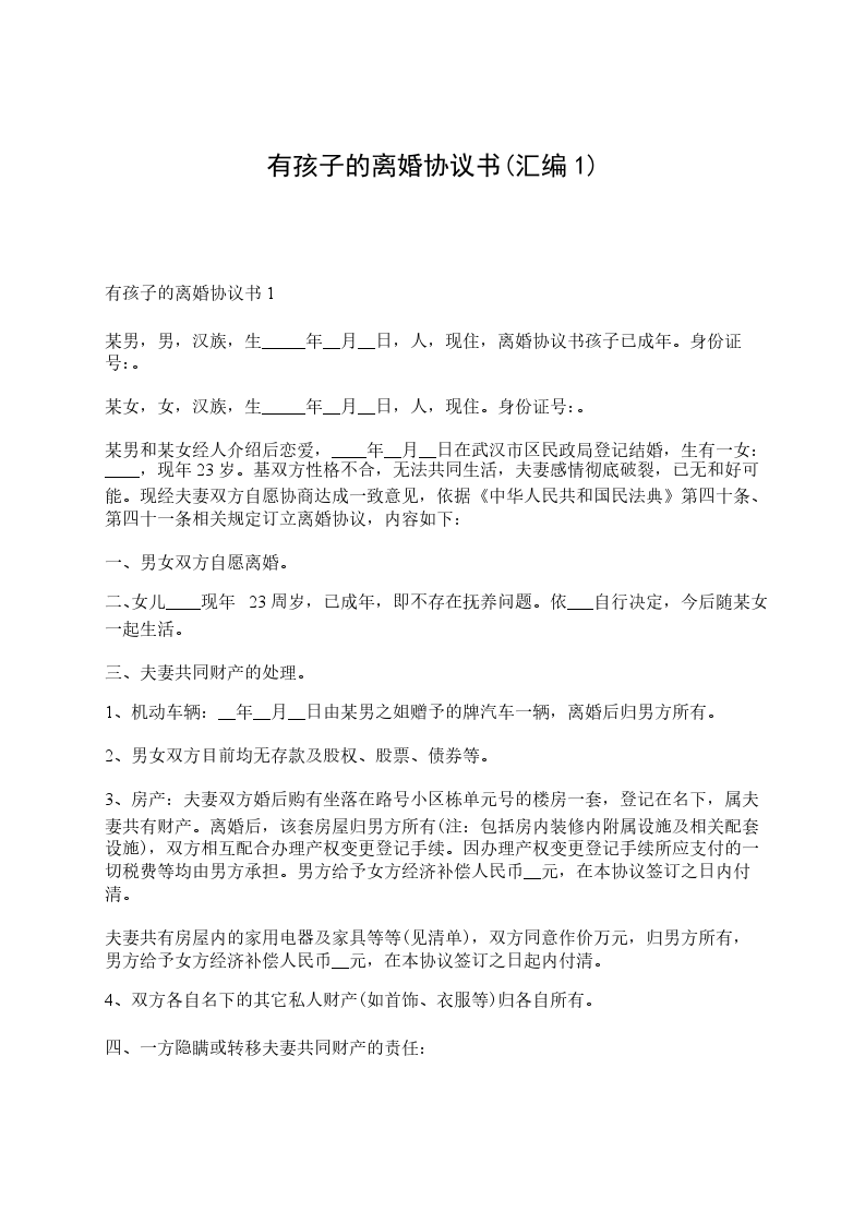 双方____年__月认识,____年__月__日在____登记结婚,婚后____年__月__日生育一儿子(女儿),名____.现夫妻感情已经完全破裂,没有和好可能,经双方协商达成一致意见,订立离婚协议如下: