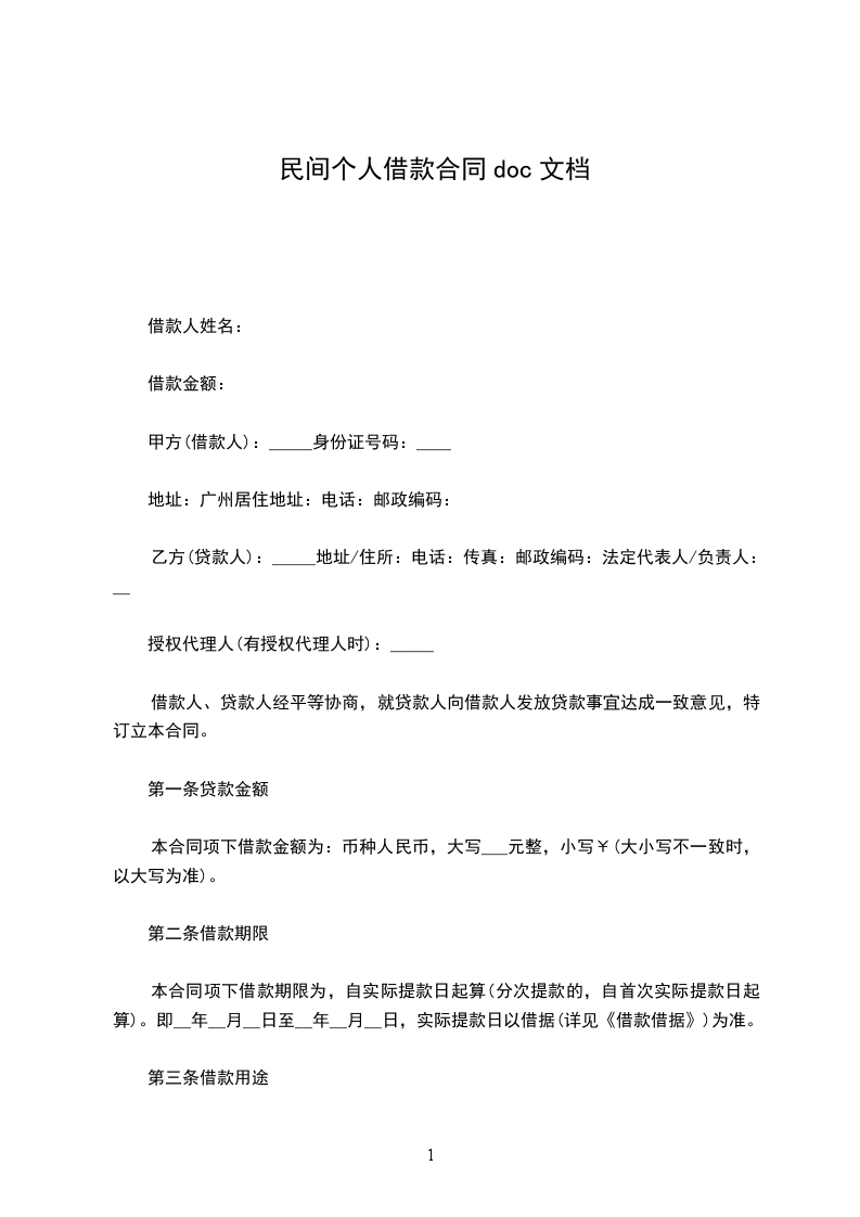 一、乙方贷给甲方人民币(大写)_____________________,_____________________前交付甲方。