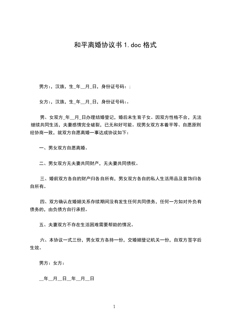 男方与女方_年__月_日在民政局登记结婚,婚后至今无小孩。因夫妻感情破裂,已无和好可能,现双方自愿协商达成一致意见,订立离婚协议如下: