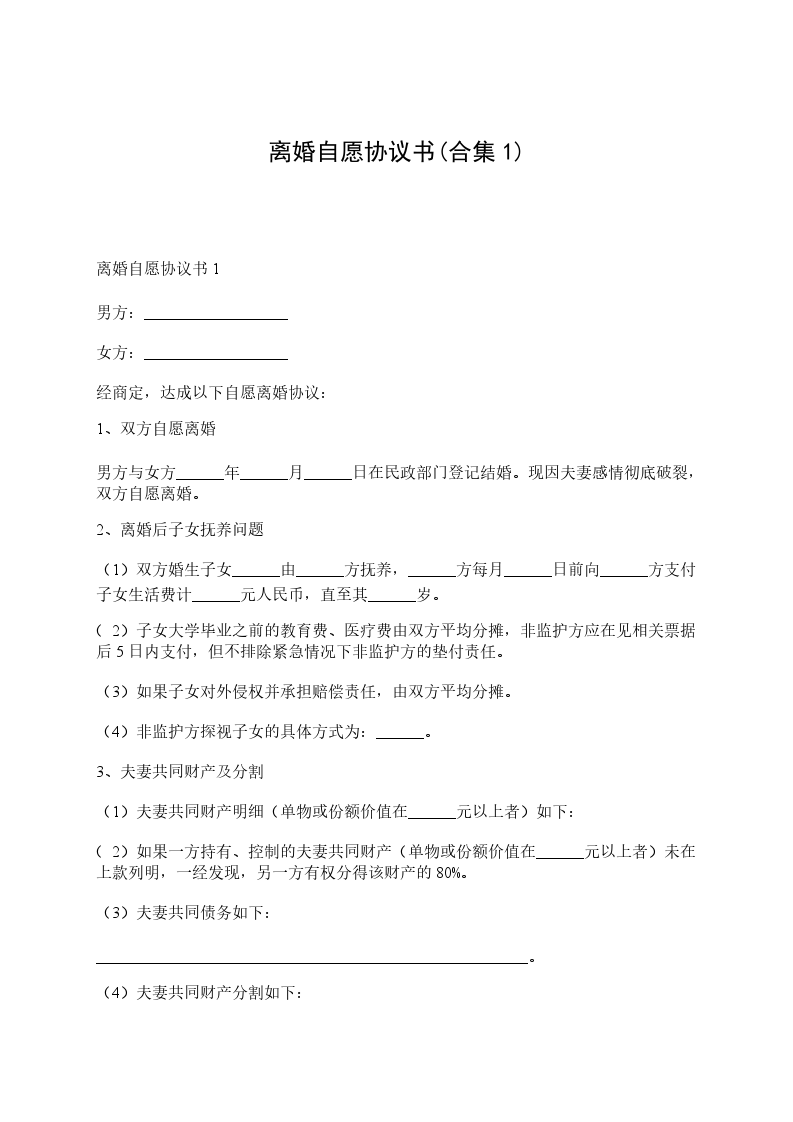 1、男、女双方系自愿签订本离婚协议。
