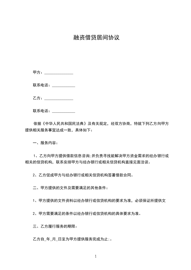 甲乙双方为发挥双方的优势,根据《中华人民共和国民法典》及相关法律、法规的规定,经双方充分协商,依据自愿、平等、公平、诚实信用原则,就乙方为甲方提供融资居间服务达成如下协议条款,以资共同遵守: