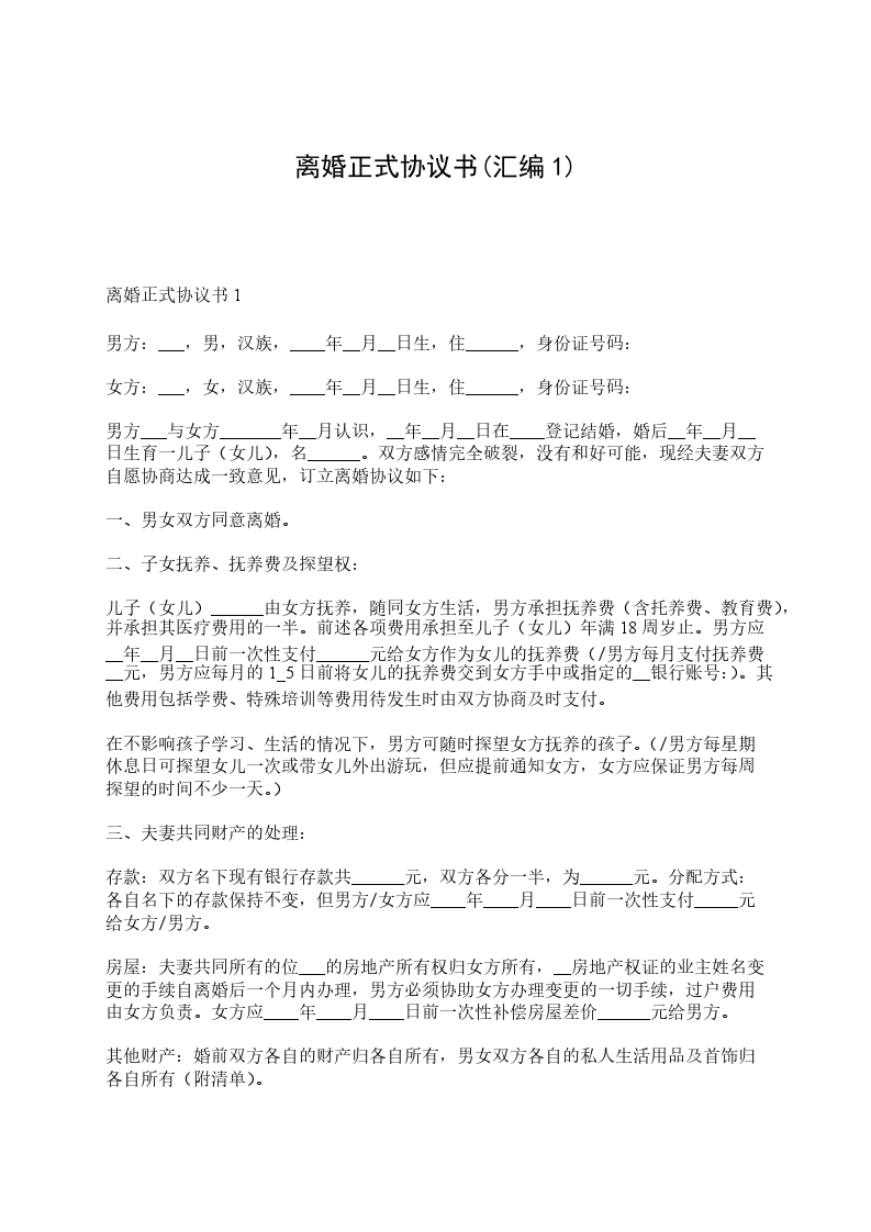 离婚正式协议书男方:_______,汉族,_______年___月___日生,身份证号码__________________________。