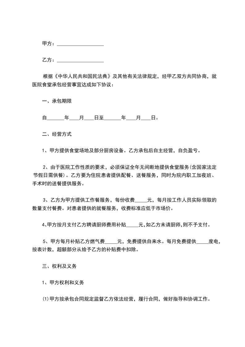 根据《中华人民共和国民法典》及其他有关法律规定,经甲乙双方共同协商,就医院食堂承包经营事宜达成如下协议: