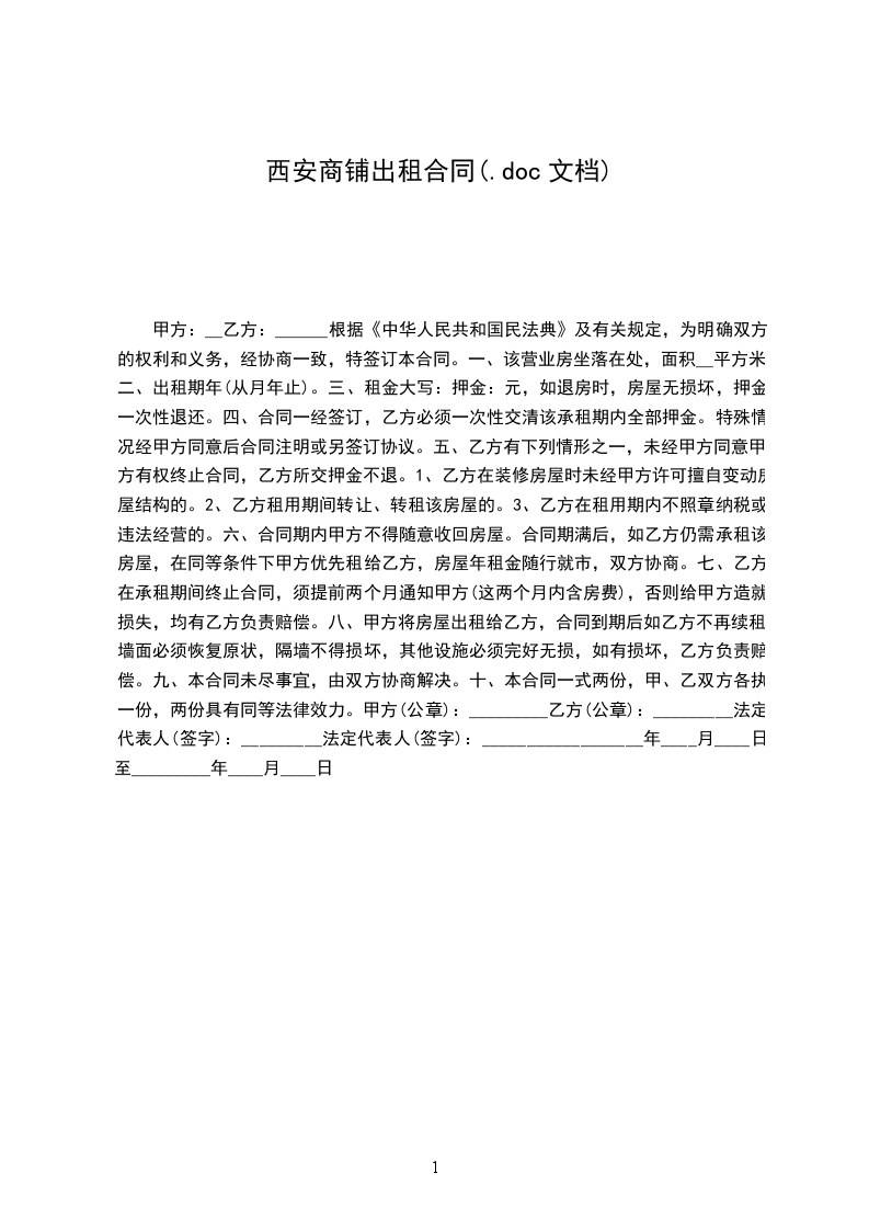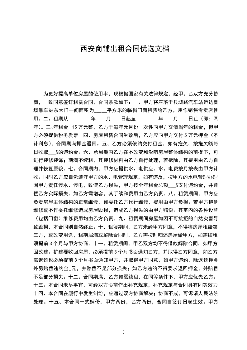 一、甲方将座落于县城路汽车站运达商场靠车站东大门一间面积为_____平方米的临街门面租赁给乙方,用作销售专卖店使用。