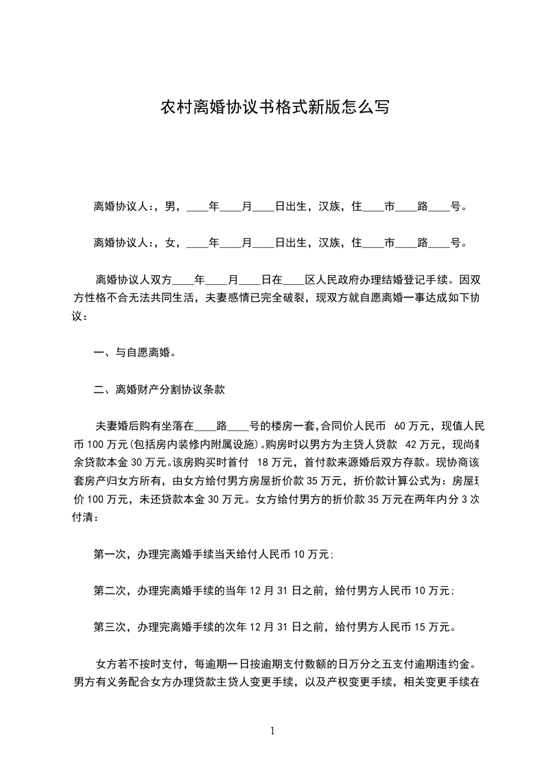 (1)存款:双方名下现有银行存款,双方各分一半,为__元。分配方式:各自名下的存款保持不变,但男方/女方应_年__月_日前一次性支付_____元给女方/男方。