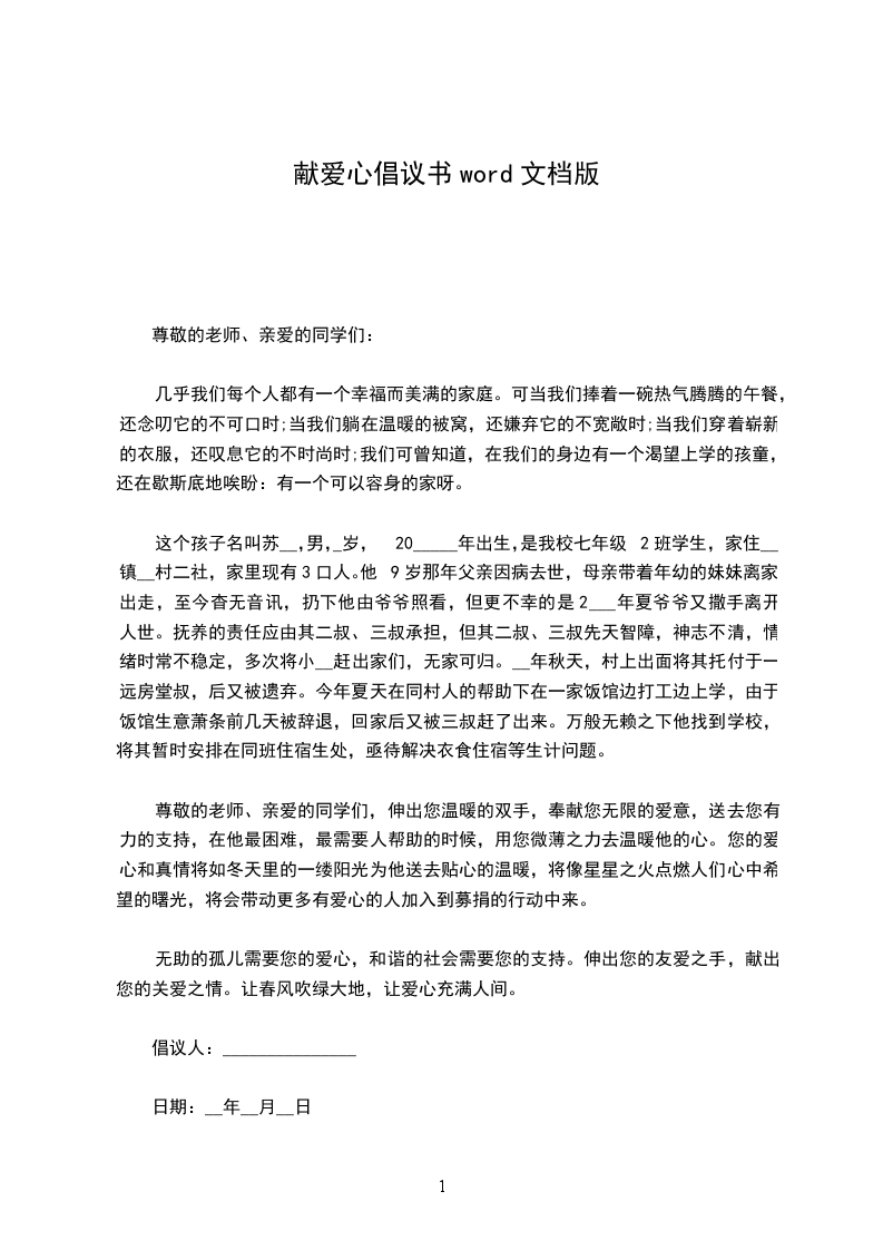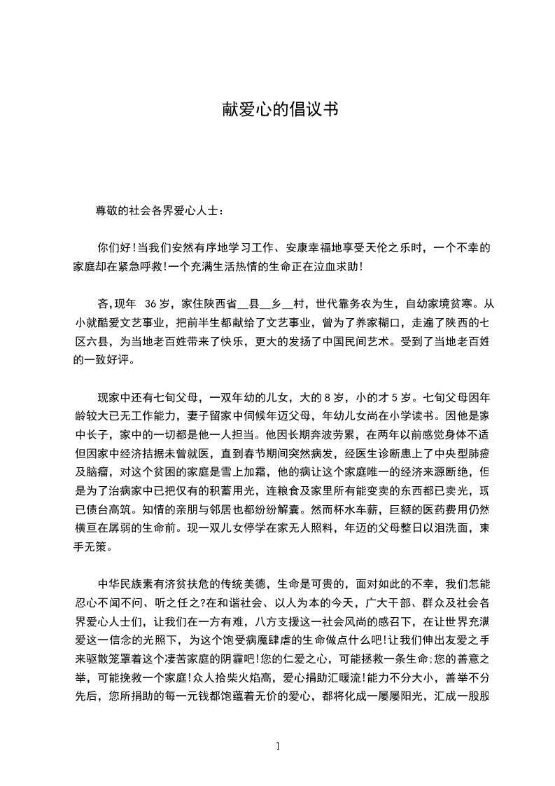 尊敬的老师、亲爱的同学们,伸出您温暖的双手,奉献您无限的爱意,送去您有力的支持,在他最困难,最需要人帮助的时候,用您微薄之力去温暖他的心。您的爱心和真情将如冬天里的一缕阳光为他送去贴心的温暖,将像星星之火点燃人们心中希望的曙光,将会带动更多有爱心的人加入到募捐的行动中来。