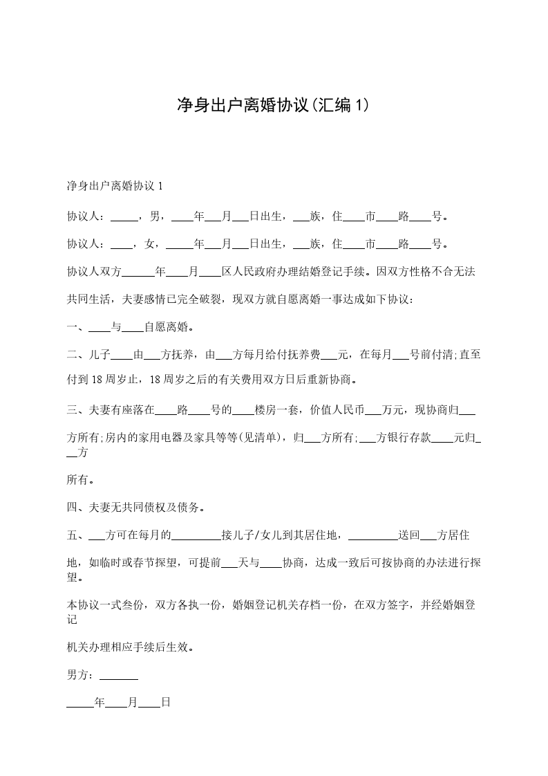 净身出户离婚协议书男方:___,男,汉族,____出生,身份证号_____________,住___。