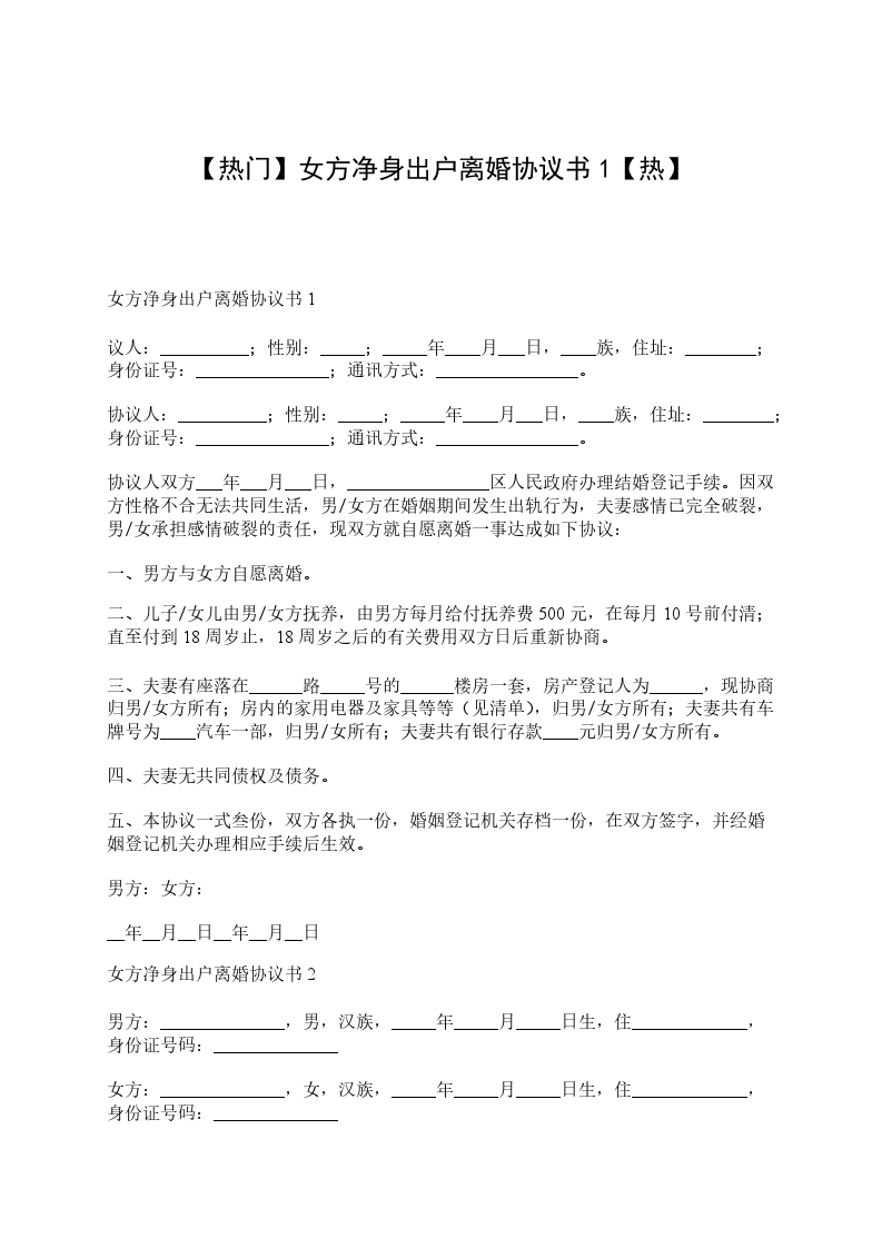 女方净身出户离婚协议书范本