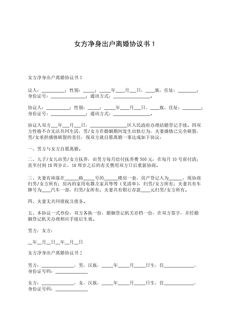 净身出户离婚协议书3协议人:______,男,______年___月___日出生,______族,住______市______路______号。