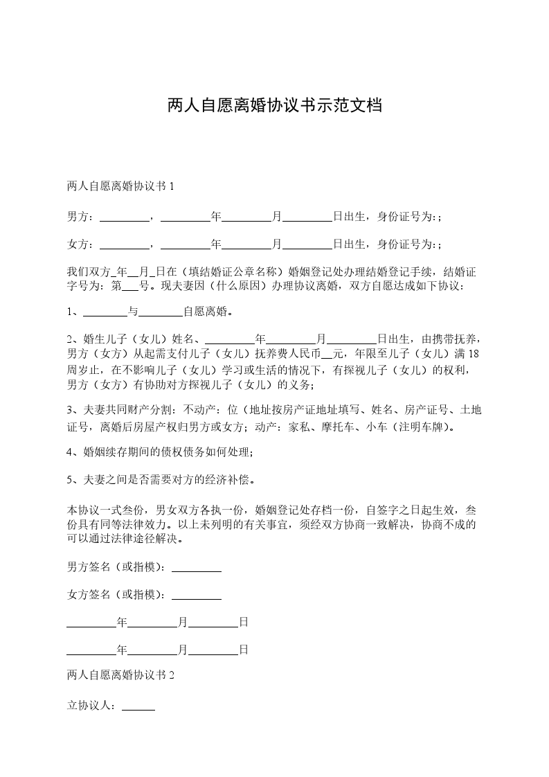 协议人双方____年____月____日在____区人民政府办理结婚登记手续。因双方性格不合无法共同生活,夫妻感情已完全破裂,现双方就自愿离婚一事达成如下协议: